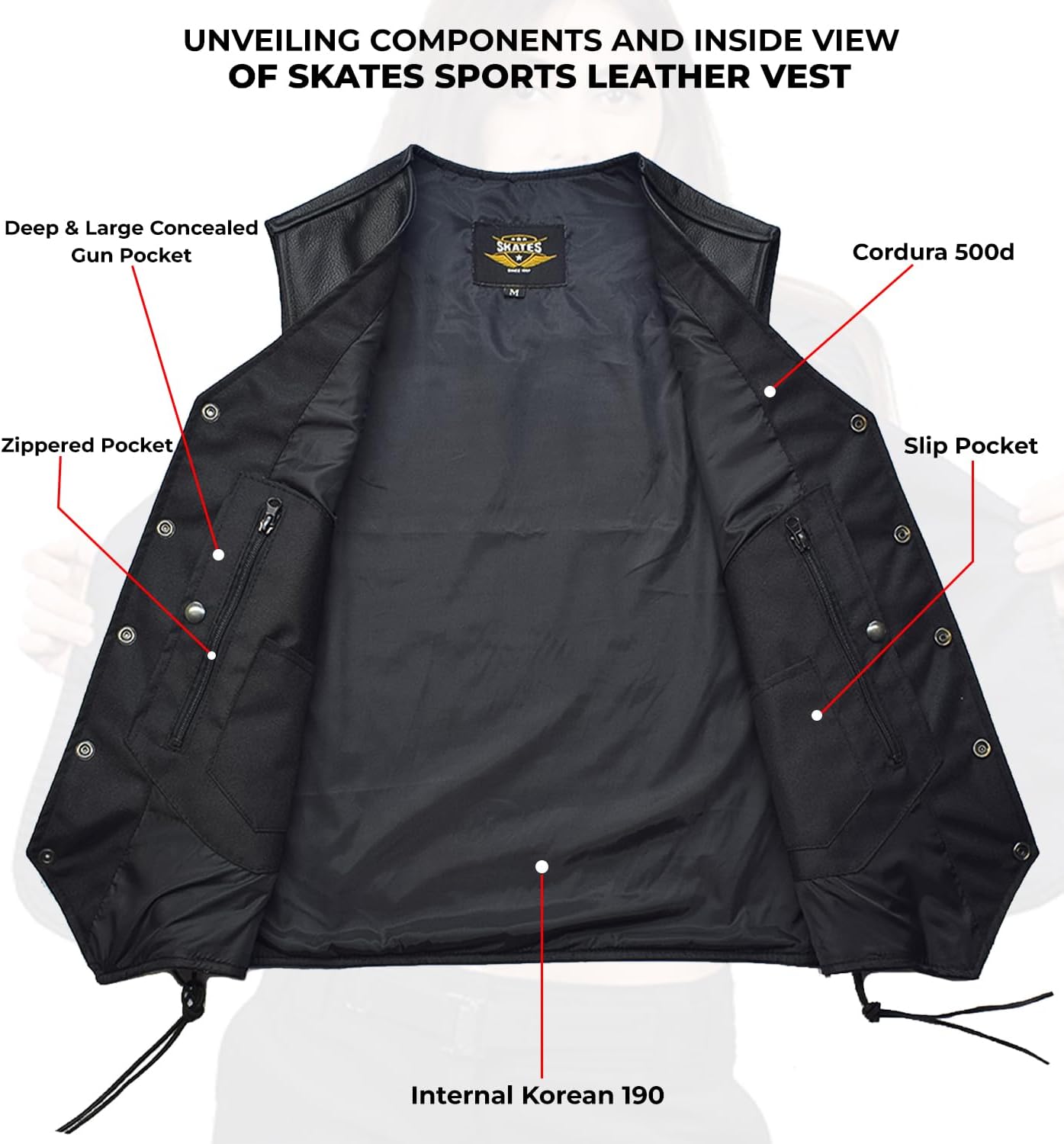 In the world of motorcycle enthusiasts, protection and style go hand in hand. Skates sports motorbike vest, meticulously crafted from heavy-duty 1.3 - 1.4 mm thick cowhide leather, is the epitome of both. This robust material guarantees effective road protection, ensuring you ride with confidence. The double stitching adds an extra layer of resilience, making the vest resistant to ripping and tearing. Dive into a world of personalized style with our men's leather vest. The 4 feet adjustable side laces on both sides not only enhance the aesthetics but also provide practicality. Adjust them to accommodate your favorite jacket or hoodie during cold weather, ensuring you stay warm without compromising on style. The V-neck front, adorned with 5 rust-proof metal snap buttons, allows you to fasten the vest securely, completing your look with finesse. Never compromise on functionality. Our riding vest boasts a thoughtful design with 10 storage pockets. The exterior features 4 pockets, including 2 zipper pockets and 2 slip pockets, while the interior offers 6 pockets for all your essentials. From concealed carry pockets with built-in holsters to zippered pockets for your smartphone, we've got you covered. Each pocket is strategically placed for easy access and secure storage, ensuring you're always prepared for the road ahead. Saddle up in style with our all-season leather vest, your perfect companion for embracing the cowboy vibe. Whether you're conquering rugged hours on horseback or hitting the open road, our western vest ensures you're not just stylish but also protected. It's an ideal gift for the modern cowboy – be it your husband, boyfriend, father, brother, or fellow bikers. Where style meets substance, our Leather Motorcycle Vest stands as a testament to the ultimate riding adventure. With sizes ranging from X-Small to 7X-Large, finding the perfect fit is a breeze. Consult our body measurement size guide to ensure your vest complements your physique seamlessly. Gear up, ride on, and make a statement with our Genuine Leather Motorcycle Vest because true riders deserve nothing but the best.