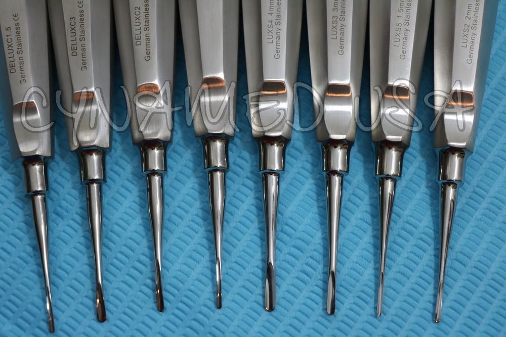 AME AS PICTURE ( 100% MONEY BACK GURANTEED ) EXCELLENT QUALITY GERMAN STAINLESS STEEL-BLUE HANDLE Luxating Elevators are designed to make extractions as trauma free as possible by cutting the periodontal ligament while easing the tooth from the socket. The result is less tissue damage that promotes quicker healing and fewer complications. Luxating Elevator is used by rocking and cutting rather than by lifting and prying the way a conventional elevator is used. The patterns include both straight blades ranging from 1.5mm to 4mm in leng