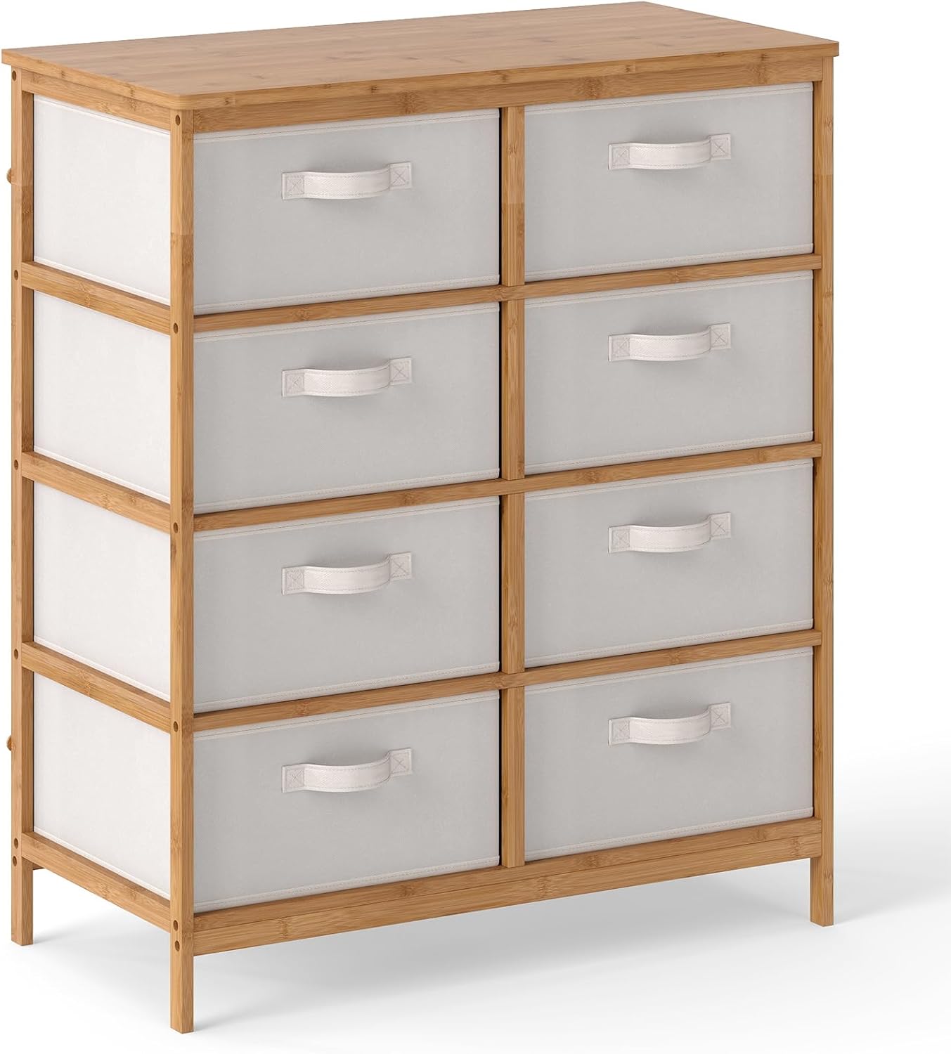 Description:Optimize your space organization with this bamboo storage dresser! Featuring 6 drawers, the storage tower is ideal for organizing clothing and accessories, along with a top shelf for displaying decorations and essentials. Moreover, the sturdy bamboo frame ensures longevity and durability while bringing a touch of natural elegance to your living space. Safety is a top priority, with included anti-toppling kits to securely anchor the dresser to the wall, providing stability and peace of mind. This contemporary vertical organizer unit combines style and utility to keep your space neat and tidy.Features:5-drawer dresser to meet storage needsEach large drawer can hold: 4-6 shirtsEach small drawer can hold: 15-20 socksAvailable in 2 varying sizes for classified storage spaceWide top with raised edges to prevent items from falling Natural bamboo material for Premium ApplicationReinforced support bars ensure reliable structureDual anti-toppling devices for extra stability and safety Equipped with non-slip foot pads to prevent scratches3-tier fabric drawers are made of non-woven fabric and MDF board5 drawers with foldable design for easy storage and setupEasy-to-clean surface for minimal maintenanceSolid beech handle for easily opening and closing the drawersSpecifications:Color: Natural Materials: Bamboo, Non-woven Fabric, Beech, MDFOverall Dimensions: 26” x 14” x 31” (L x W x H)Internal Dimensions of Drawer: 12” x 14” x 7.5” (L x W x H)Raised Height: 4”Weight Capacity of Top: 44 lbsWeight Capacity of Each Drawer: 22 lbsNet Weight: 14 lbsPackage Includes:1 x Dresser1 x User Guide