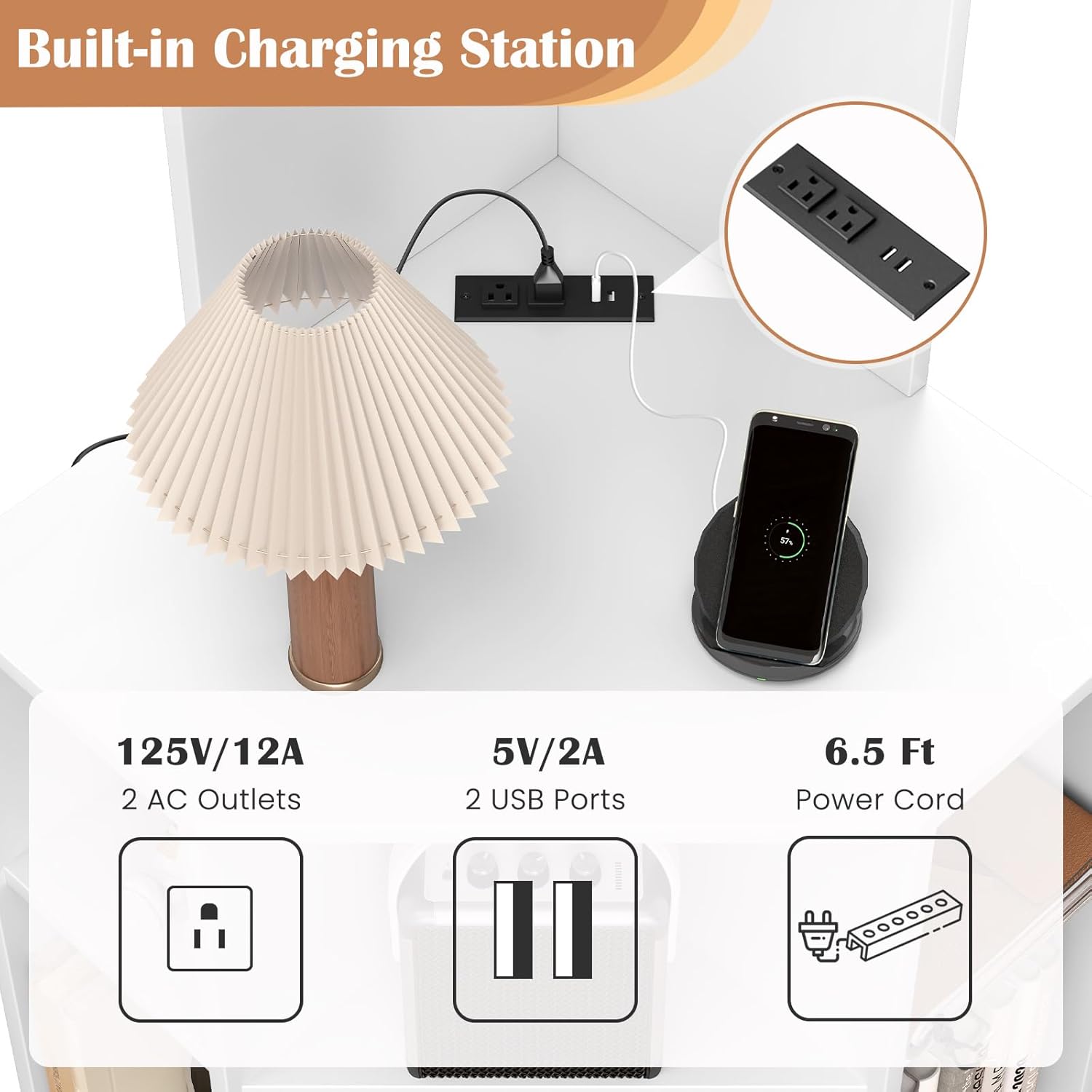 Description:Maximize your space and enhance functionality with our 6-tier corner shelf!Equipped with a built-in charging station including 2 AC outlets and 2 USB ports, the corner storage cabinet meets your daily charging needs. The 12 open storage cubbies cater to all your storage and display needs, while the right-angle design effortlessly fits into corners for space-saving. Crafted with thickened boards for durability and outfitted with an anti-toppling device for added safety, it ensures your items are securely stored. Whether used as a display rack, storage shelf, or bookshelf, the corner cube shelf is a stylish and practical addition to any room.Features:Built-in charging station with 2 AC outlets and 2 USB ports for your convenience12 open compartments provide ample storage space and allow for easy accessRight-angle design effortlessly fits into corners for space-savingAnti-toppling device ensures greater stability and safetyThickened boards provide strong support and long-lasting durability6.5 ft power cord offers extended reach for convenient placementNon-slip foot pads offer floor protectionEasy-to-clean surface saves you time and effortAssembly is required before useSpecifications:Color:Rustic Brown/WhiteMaterial:Engineered WoodOverall Dimensions: 18.5" x 18.5" x 63" (L x W x H)2 AC Outlets: 125V/12A2 USB Ports: 5V/2APower Cord Length: 6.5 ftWeight Capacity of Countertop: 66 lbsWeight Capacity of Each Cube: 22 lbsTotal Weight Capacity: 310 lbsNet Weight: 62 lbs
