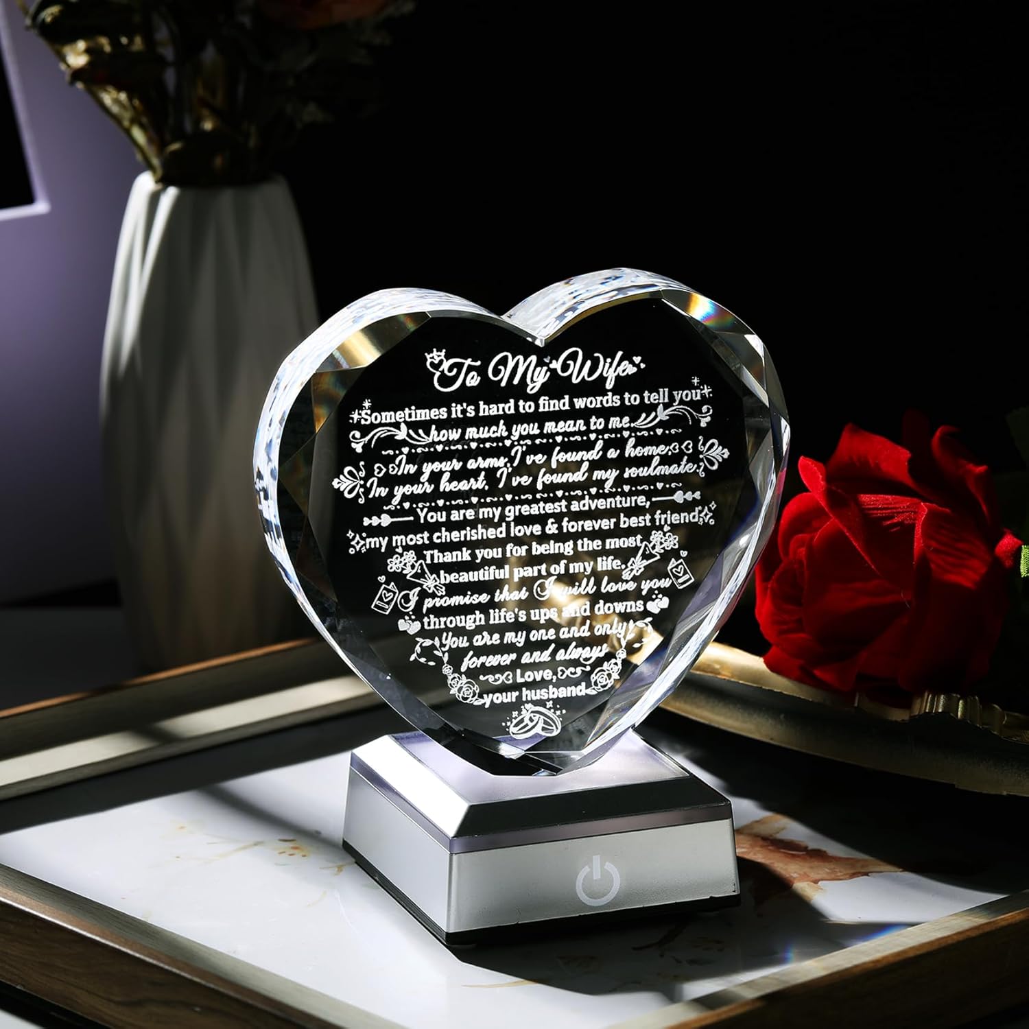 If you are looking for an exquisite and unique gift for your wife, want to express your love to her, and make your wife feel surprised, this crystal heart souvenir with love sayings will be a good choice. It is proof of love for wife and a romantic gift for her. She can't resist this charming decoration, she will be very moved when she receives such a gift and it will undoubtedly catch her heart. Product Specification: Material: K9 Crystal Feature: Laser engraving Package Include: 1 x Crystal keepsake 1 x Gift box 1 x Gift card 1 x Wiping cloth 1 x LED light base 1 x Charging cable Instructions of the base: Press the button for the first time, the light will change colors very slowly. Press it again and the light will change colors faster. When the button is pressed for the third time, the light will change color to white and stop changing colors automatically and each time the switch is pressed thereafter, the light will change and stay in one color. The fourth time you press the button, the color of light is red; the fifth time is blue and the sixth time is green. Press it the seventh time, the light will turn off. Press and hold the switch for three seconds to turn off the light regardless of the mode.