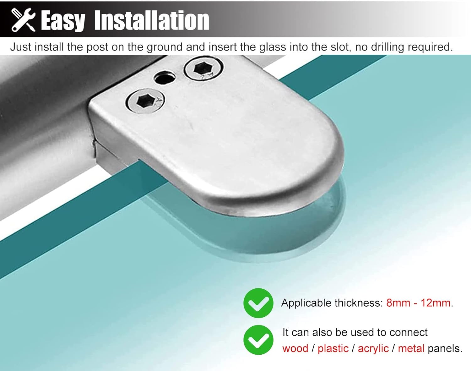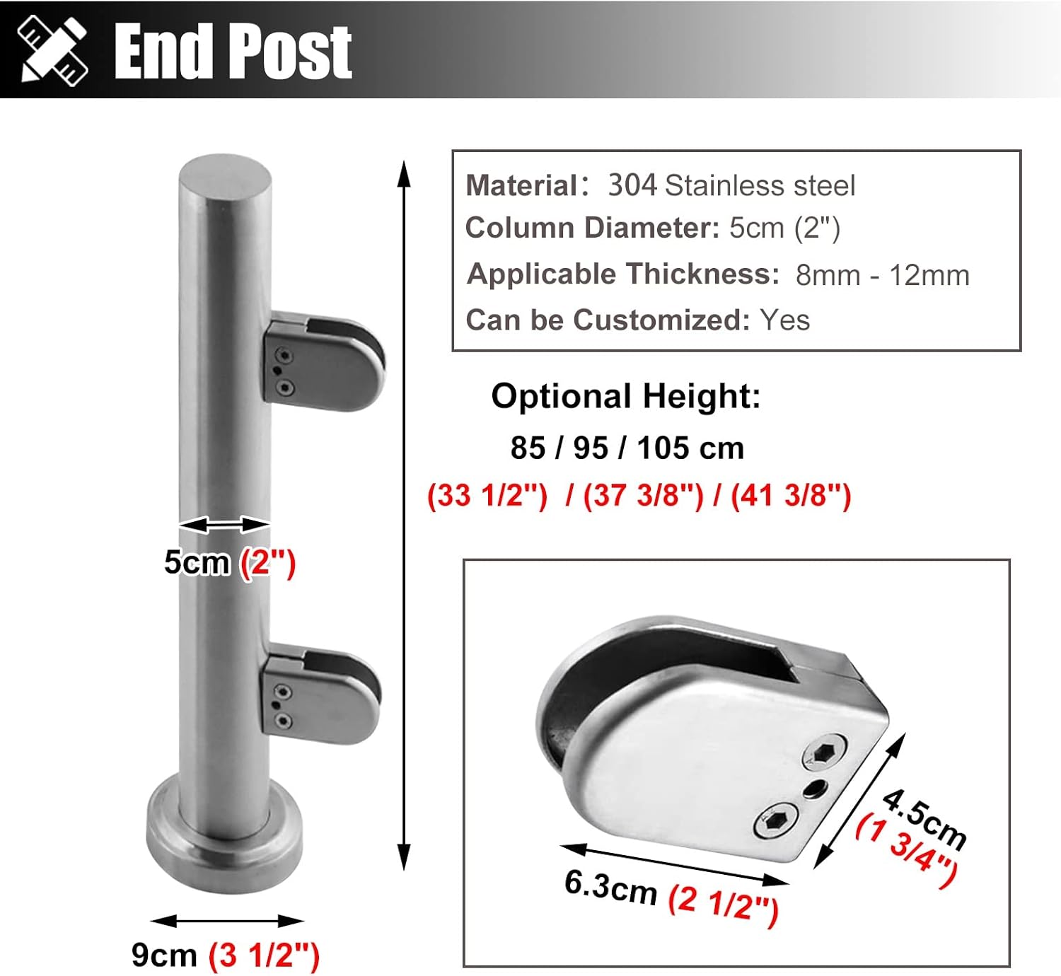 Package Contents: 1 × Glass Railing Post(Including Install Fitting)Specification:- Material: 304 Stainless Steel- Post Diameter: 5 cm (2")- Base Diameter: 9 cm (3 1/2")- Suitable for Glass Thickness: 8 mm - 12 mm (1/4" - 1/2")- Can be Customized: YesFeature:- High strength metal material withstand long-term use.- Thickened base stable and secure, strong bearing capacity.- Designed to clamp glass, wood, plastic or metal panels.- No need to drill holes in glass, easy to install.- Widely used for personal or commercial use.- Suitable for interior or exterior / wet or dry occasions.Please Note:- You might need multiple railing post to build a complete frame based on different project situations: End Post, Mid Post, Corner Post.- The decorative items shown in the product photos are not included.- Due to the light and screen difference, the item's color may be slightly different from the pictures.- There may be slightly deviation in dimensions due to manual measurement. Thank you for your understanding.Efficient Customer Service:- In the process of receiving or using the product, if you encounter any problems, please feel free to contact us. We value your comments and offer help for you.