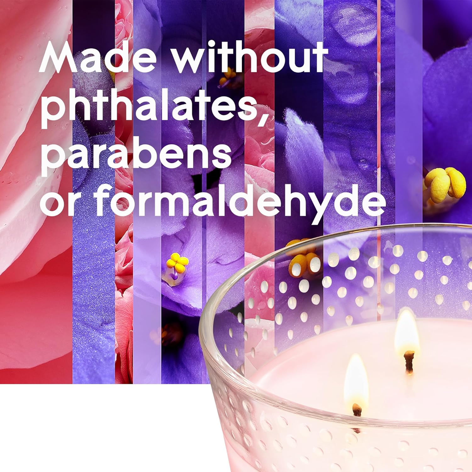 Meet your next go-to candle, and reward your ritual. The Glade Rose & Bloom three wick candle is just what you need to ignite your self-care routine. Surround yourself with scent that’s been expertly crafted by master perfumers. Whether it’s Me-time with a book or a long luxurious bath, these Glade jar candles will help create your secret garden. The fragrance is infused with essential oils and features enriching notes of pink rose, violet leaf and sandalwood. You’ll definitely want to take a second smell and set an inspiring vibe. While you’re relaxing, it’s also good to know that these large scented candles are made without phthalates, parabens, formaldehyde or nitro musks. The warm glow and crafted scent quickly create a special atmosphere. So go ahead and discover the expertly crafted Glade candle collection. It delivers the scent treat you’ve been searching for. With the Glade Rose & Bloom candle, you’ve found your self-care soulmate. Candle burning tips: For best performance, burn two to four hours at a time. This will maximize the life of your candle. Trim the wick to 1/4 inch each time before you burn, and be sure to remove any wick debris in the candle before lighting. Do not touch, lift or move a burning candle. Wait until the wax has cooled and hardened before touching a candle. For optimal performance, keep burning candles away from drafts, vents and air currents. Stop using your Glade Jar Candle when 1/4 inch of wax remains. Be sure the candle jar is placed on a stable, heat-resistant surface. Never place flammable materials near a candle. Never burn candles unattended. Do not burn candles where they can be knocked over by children, pets or anyone else.