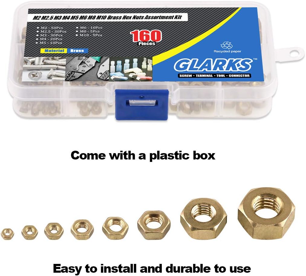 Glarks 160Pcs Metric M2 M2.5 M3 M4 M5 M6 M8 M10 High Strength Brass Hex Nuts Assortment Kit Specification: Product Type: High strength hex nuts set Material: Brass Size: M2 M2.5 M3 M4 M5 M6 M8 M10 Thread: 0.4, 0.45, 0.5, 0.7, 0.8, 1, 1.25, 1.5mm Package Detail: M2 x 0.4mm ---------------- 50PCS M2.5 x 0.45mm ------------ 30PCS M3 x 0.5mm ---------------- 30PCS M4 x 0.7mm ---------------- 200PCS M5 x 0.8mm ---------------- 10PCS M6 x 1.0mm ---------------- 10PCS M8 x 1.25mm --------------- 5PCS M10 x 1.5mm --------------- 5PCS Total Quantity: 160Pcs ♥Note: ♡ These coarse nuts for coarse threaded bolts, be sure not to strip your nuts by over tightening. ♡ Please check the specific size of the product according to the second picture. ♡ Due to manual measurement, there may be an error of 0.1-0.3mm, please don't mind.