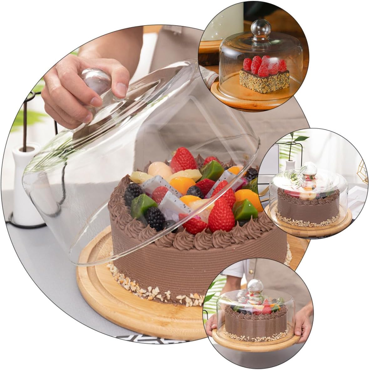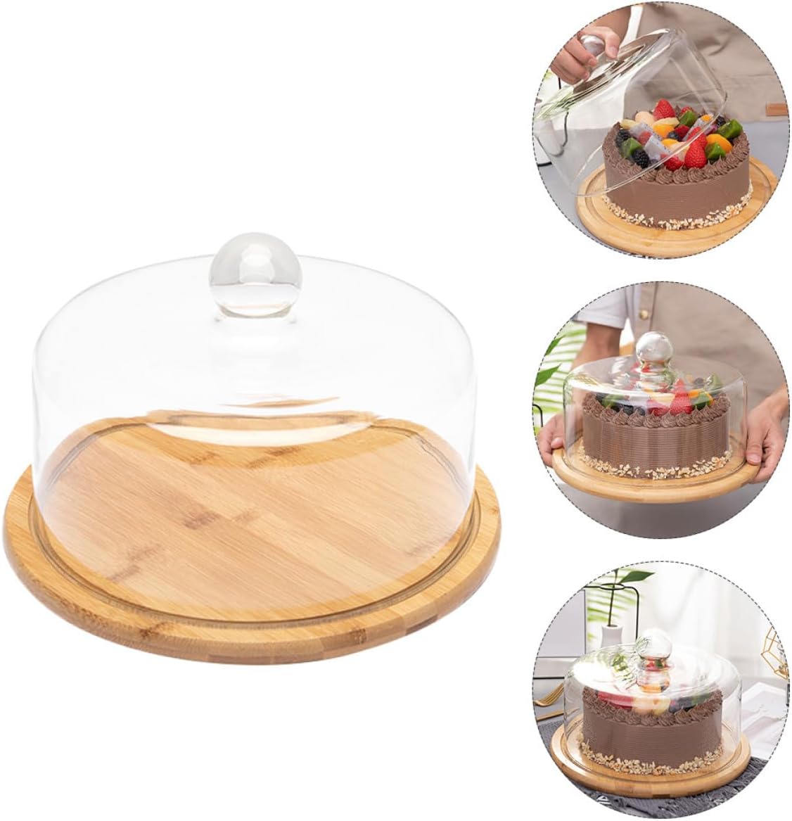 Package List1 x food tray with glass coverCharacteristics-Color: Assorted color.-Material: and glass.-Size: About 23.50X23.50X16.50cm / 9.24X9.24X6.48inch.-The wooden tray is stable, you can place food on confidence.-This glass cover can be used to cover your cake, dessert, snacks, etc.-It has an elegant look in banquet anddds to any table's aesthetics.-Add elegant appeal to your table or kitchen island with this cake plate.Goods InformationCrafted with sturdy tray and thick, transparent glass cover, this cake display plate offers a stable and elegant platform for presenting desserts, cakes, and snacks. The rounded handle easy lifting of cover while allowing clear visibility of food beneath. Suitable for various occasions such as parties, kitchen use, and restaurant settings, this multipurpose food tray enhances table aesthetics and keeps treats protected from dust andirborne particles. Its practical design simplifies cleaning and maintenance, making it convenient choice for daily use and special events. Bring refined presentation and functional protection to your serving dishes collection with this versatile dessert display plate that fits well into home and dining environments.From ZHIHUICX was inspired by desire to blend natural materials with elegant design for everyday dining. Our cake display plate reflects this vision by combining craftsmanship with clear glass to enhance food presentation. creating serveware that turns simple meals into . Celebrate your gatherings with ZHIHUICX's thoughtful designs.