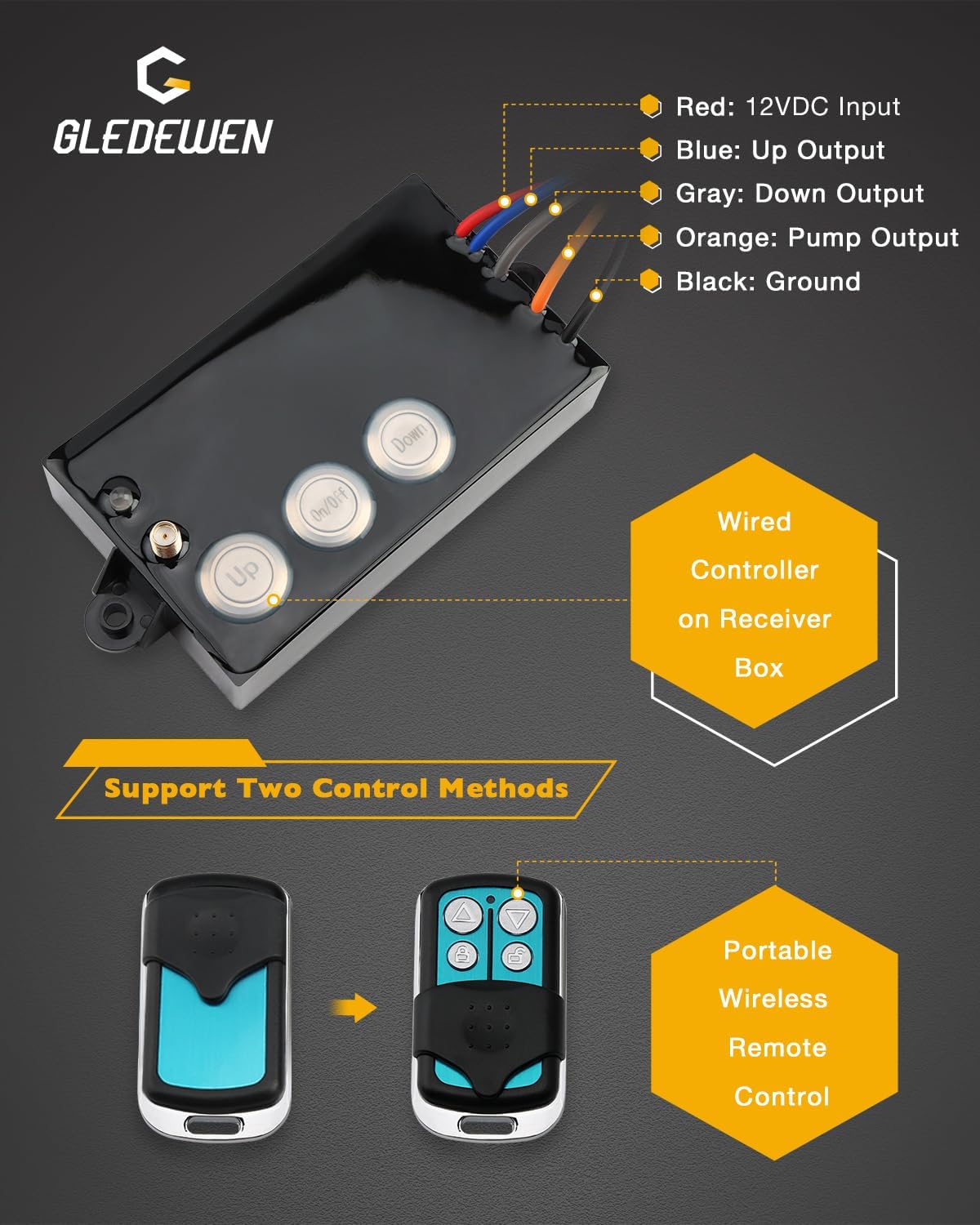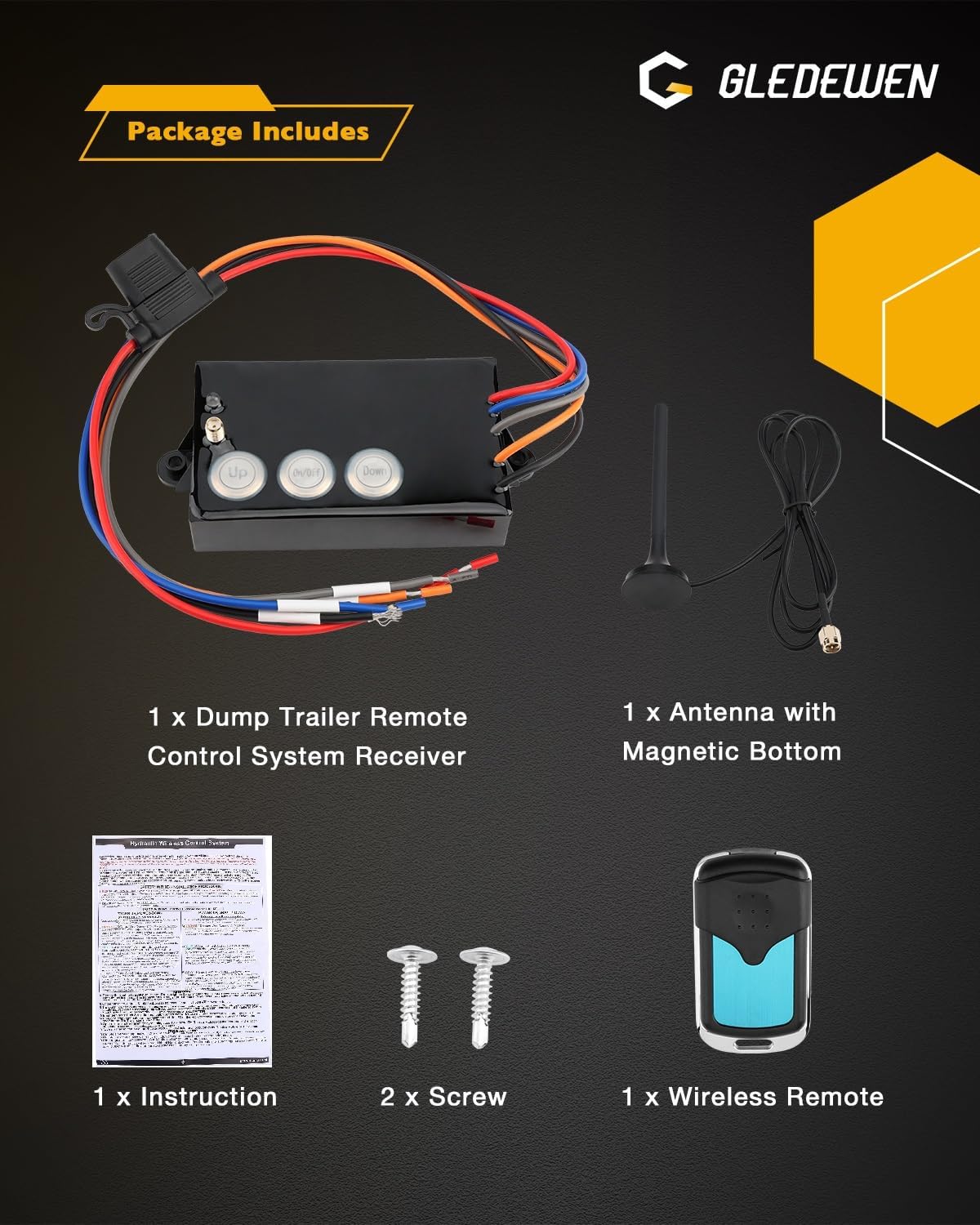 Packing List:1 x Dump Trailer Remote Control System Receiver1 x Antenna with Magnetic Bottom1 x Wireless Remote2 x Screw1 x InstructionCondition: NewPrecise Fit Part Numbers:G3-H01Compatible with: Hydraulic Pump, 12 Volt(Dump Trailers, Trailer Jacks, Boat Lifts, Snow Plows, etc.)Specifications:Works in 12 volt applications50′ – 100′ operating rangePotted for protection“Learning” TransmitterBelow 9 volt indication light1-minute automatic time-out featureIn-line fuse already installedBack-up manual switches on receiverOn/Off switch on XMTR and ReceiverOperating Voltage — +9V DC to +28V DCMaximum Current — 10 Amps DC MaxOperating Temp — -40℃ to +125℃Function: If you are tied to operating the hydraulic pump by tethered remote, we strongly suggest you order a wireless dump remotes kit. The wireless remote control system works well from inside tow vehicles, even farther range. This is a simple and convenient one-hand operation system, in addition to wireless remote control, wired control is still supported.We are a factory direct saler. Customers can spend a small amount of money and get a high quality brand new winch remote control kit. This hydraulic wireless control system provides excellent value at the cheapest price.Own it now.