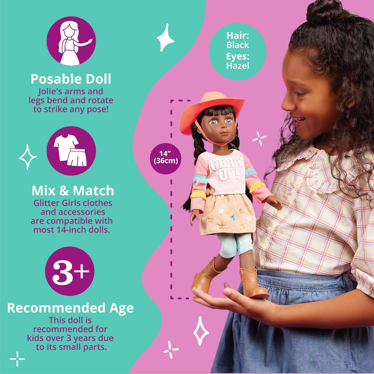 Meet Jolie at the stables! This 14-inch Glitter Girls doll loves joining show jumping competitions and rounding up her horse pals for galloping adventures! Jolie has bright green eyes, long eyelashes, and long, silky brown hair styled in two braided pigtails. But you can style her hair in a lot of different ways! She is a poseable doll who can bend and rotate her arms and legs to gallop on equestrian adventures when it's time to saddle up! Glitter Girls dolls each come with one complete outfit. Jolie is wearing a “Giddy Up!” top with fun fringe details on the sleeves, a skirt with decorative stars, a pair of light-blue leggings, riding boots, and a stylish cowgirl hat (for an extra touch of glitz!). Her outfit also has easy-open closures to quickly put on and remove, so Jolie can explore the countryside in many colorful fashion looks!
