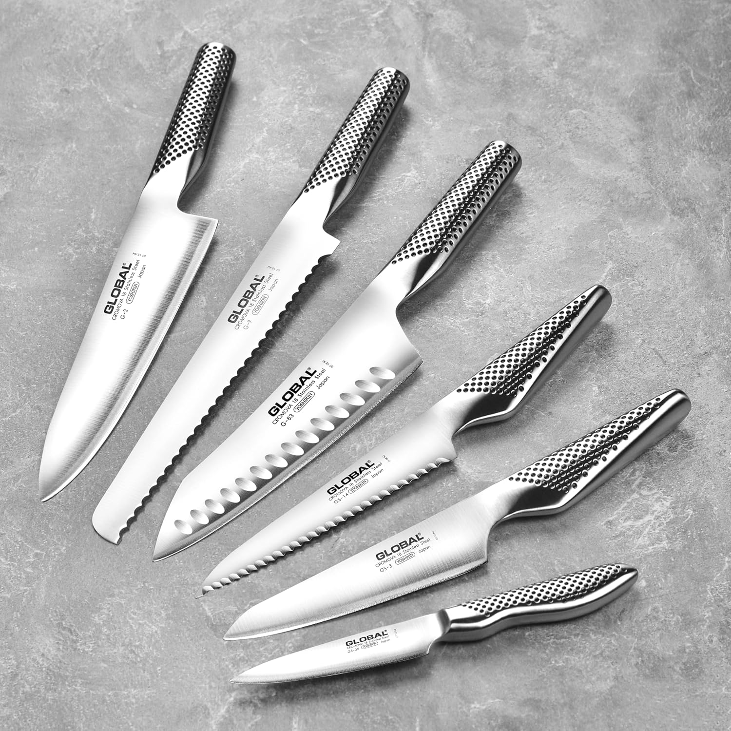 | Included Components | Global 3.5" Paring Knife, 5" Chef's Prep Knife, 6" Serrated Utility Knife, 7" Hollow Edge Asian Chef's Knife, 8" Chef's Knife, 8.5" Bread Knife, Four 4.5" Fine Edge Steak Knives & 10 Slot Acacia Wood Knife Block |