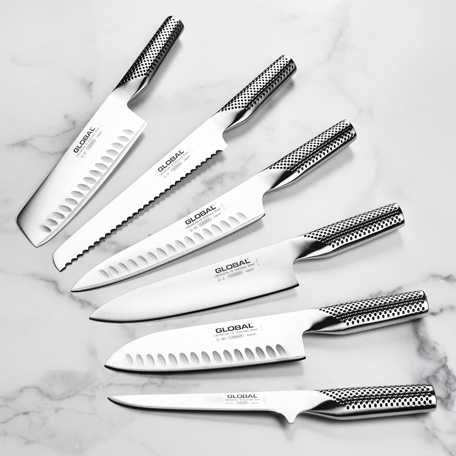 Global knives contain two innovative features, their edge and the way they are balanced. The most important detail of any knife is its edge, and the Global edge is truly its signature. Global knives are sharpened or ground steeply to a point, and to an acute angle while resisting rust, stains and corrosion. The straight edge results in a dramatically sharper knife which stays sharper longer. The edge on a Global knife is so large and prominent that it is easily seen with the naked eye and extends a quarter of an inch or more up from the tip of the knife. From its modest inception, Global has developed into one of the most successful brands of professional kitchen knives in the world. Still crafted by hand in Yoshikin's factory in Niigata, Japan, Global knives are manufactured to extremely high and exacting standards. Global has attracted much acclaim over the years and received numerous awards. A thousand years ago, Japanese sword-smiths developed the high art of sword making to provide strong, sharp blades for the Samurai, the feared warrior caste. Like the Samurai swords before them, each knife is carefully weighted to ensure perfect balance in the hand. Global knives are handcrafted in Japan using the same traditions and developed using the best raw materials available.