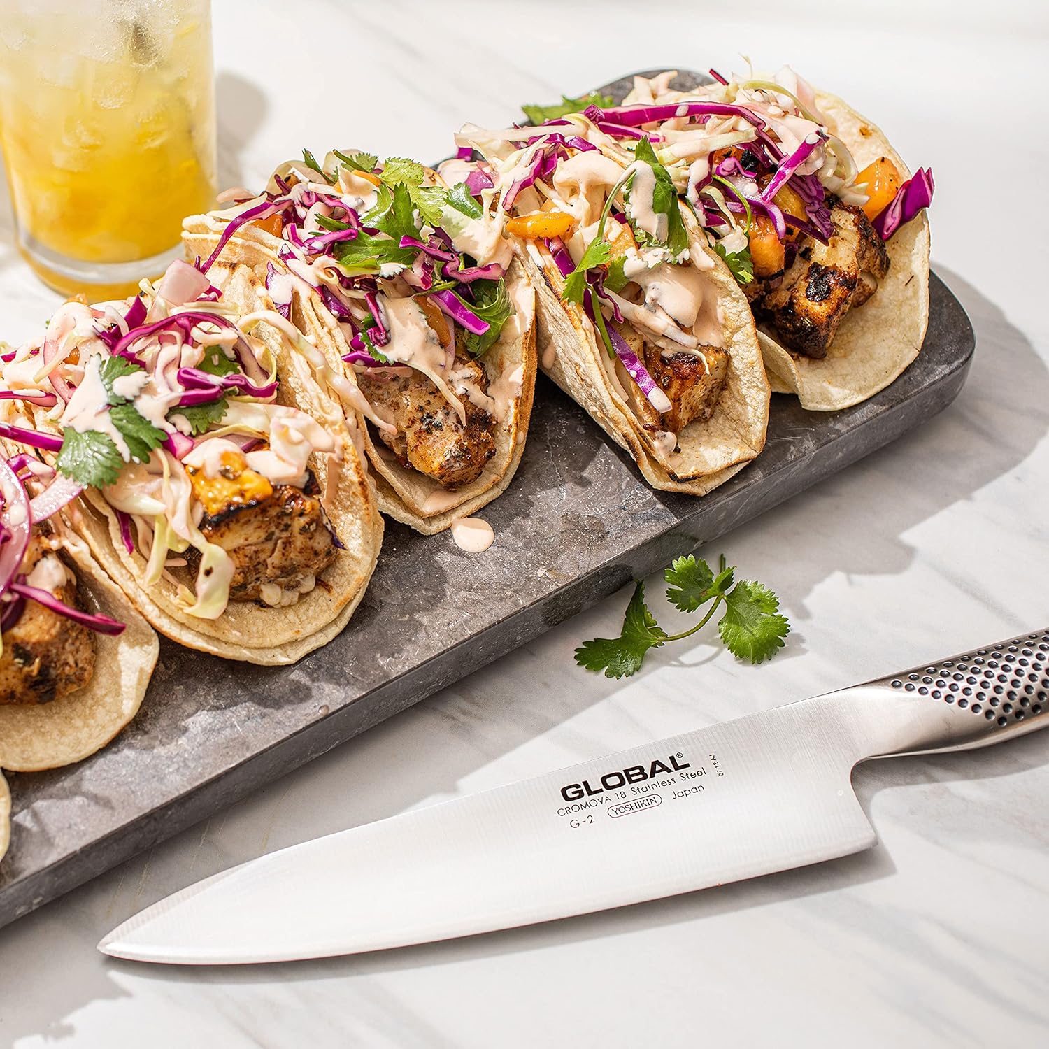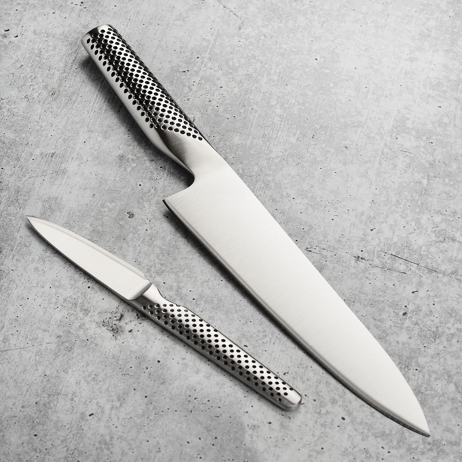 Global Knives have two most innovative features - their edge and the way they are balanced. The most important feature of any knife is its edge. The blade is made from one of the finest steels- CROMOVA 18 stainless steel. This special steel is ice-tempered and hardened to a Rockwell Hardness of 56-58, which remains razor sharp longer than any other steel and resists rust, stains and corrosion. The blade edge is ground on both sides of the blade like western style blades; however the edge is ground to a straight point rather than a beveled edge which results in a razor sharp edge that will stay sharper longer. To balance the blade, all Global knives have a unique hollow handle filled with the right amount of sand to create the perfect balance. Global knives are truly unique. Made in Japan.