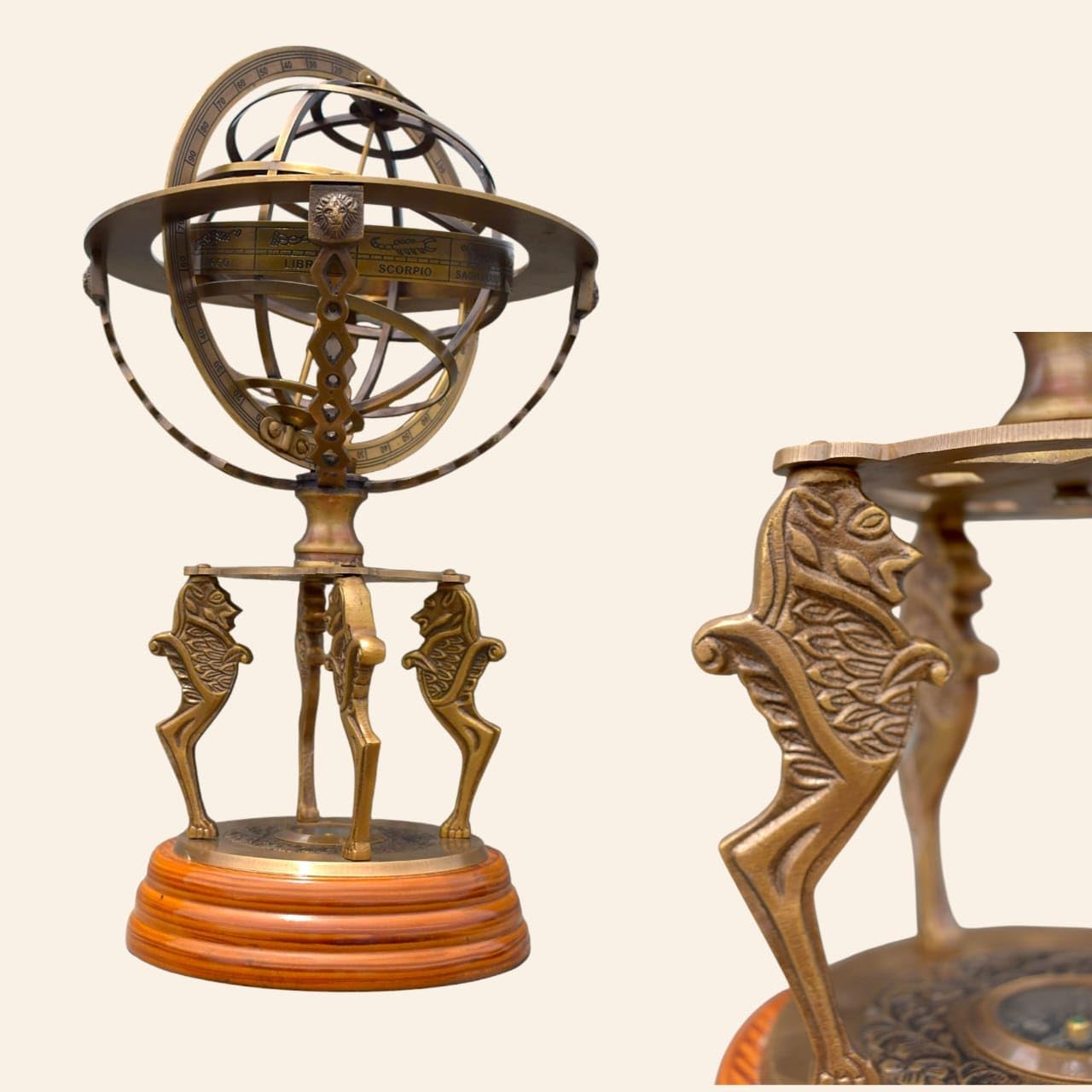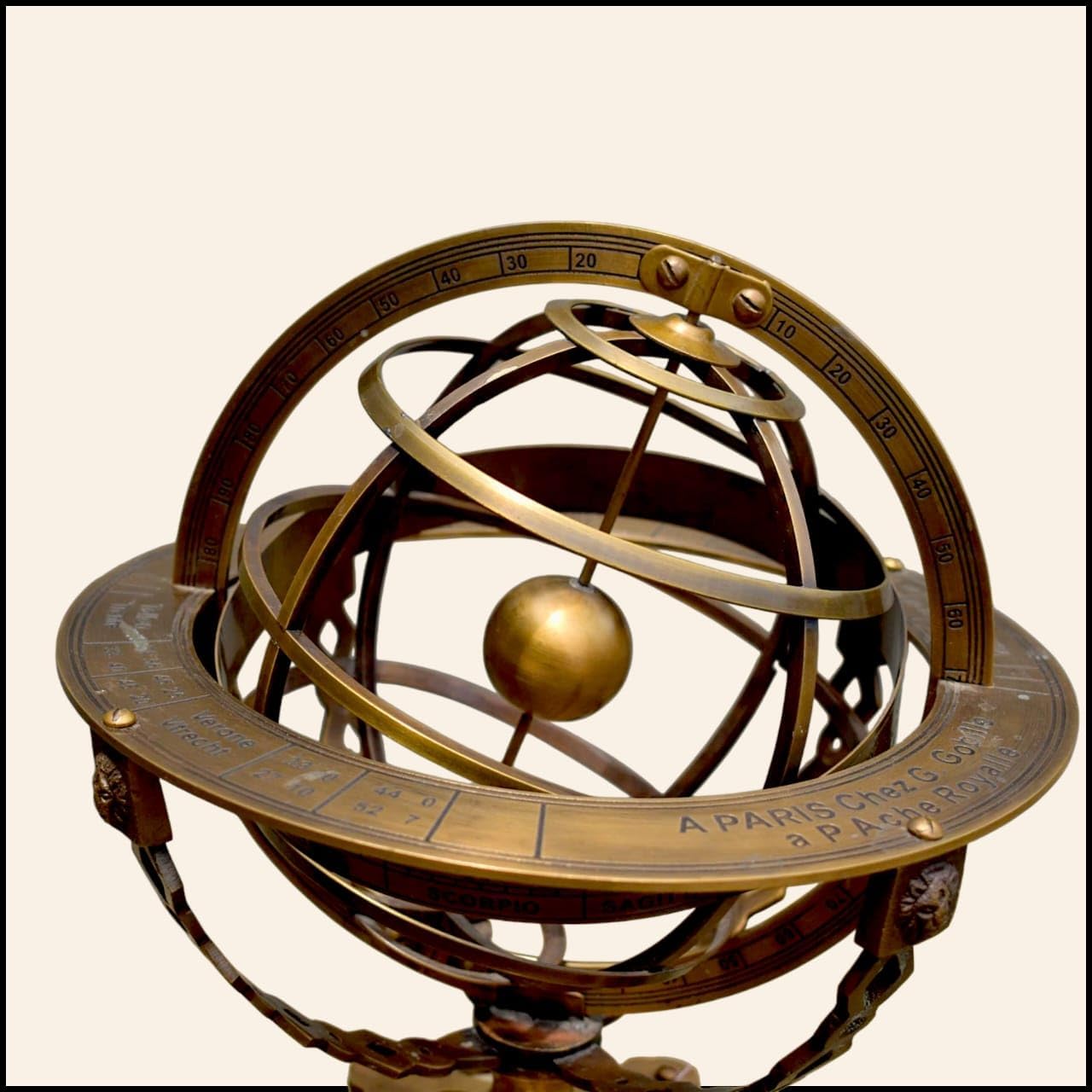 Step into the fascinating world of celestial mechanics with this exquisite 18-inch armillary sphere, crafted in the distinguished Parisian style by G. Gobille. This masterfully constructed astronomical instrument features intricate brass rings representing the celestial coordinates and zodiac belt, all revolving around a central axis. The sphere's complex framework demonstrates the apparent motion of stars and celestial bodies, while its graduated scales offer precise astronomical measurements. Mounted on an elegant wooden base with decorative tripod supports, this piece serves as both a sophisticated scientific instrument and a stunning decorative accent. The antiqued brass finish and traditional design elements pay homage to classical astronomical instruments, making it a captivating focal point for libraries, studies, or sophisticated living spaces. The detailed zodiac ring and coordinate markers are precisely engraved, showcasing the meticulous craftsmanship characteristic of fine astronomical instruments. This armillary sphere stands as a testament to the timeless appeal of scientific instruments transformed into artistic masterpieces.