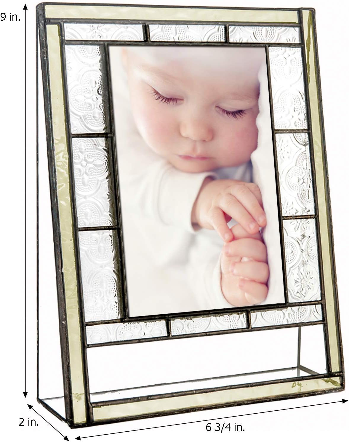 Let us custom engrave this beautiful glass picture frame for a godmother/godparent who holds that special lifetime role. Add the extra touch of thoughtfulness with a personalized gift. There are two lines available for engraving below the photo, use our suggested message with a name below or be creative! The engraved lettering will appear in a white frost on the clear glass. Note-the ‘double hearts’ are a constant and will appear on your frame. Clear glass with an embossed vintage texture trimmed with antique veil (very pale yellow beige) are the perfect combination for this photo frame. This table top 4x6 vertical (portrait) picture frame features glass sides providing stability and style unique to J Devlin frames. It is ascetically pleasing from all angles and your photo can be easily inserted into the back. Each picture frame is carefully handcrafted by skilled artisans using a copper foil and solder technique developed by Louis Comfort Tiffany in the late 1800’s. This age-old art form combined with 21st century designs creates the perfect combination for unique home décor. All designs are J Devlin originals…enjoy!
