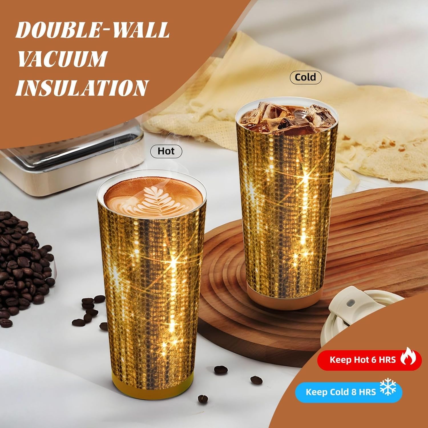 This Gold Sequin Sparkle Print travel Coffee Mug supports three drinking modes: the direct drink spout for quick drinks during commutes, the straw port for iced coffee and other spill prone beverages, and the open top design that replicates the traditional coffee cup experience. BPA Free 316 Stainless Steel, Safe and Durable Inner liner made of food grade 316 stainless steel, non toxic, odorless, BPA free, safe for long term use.