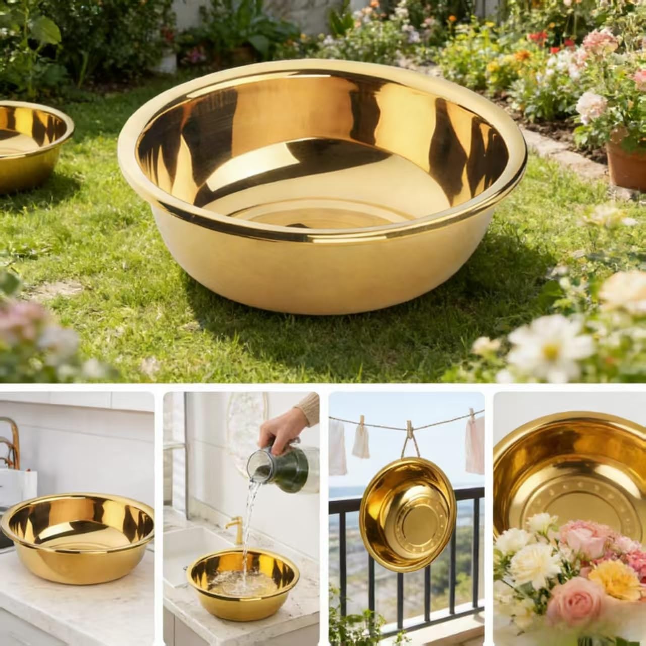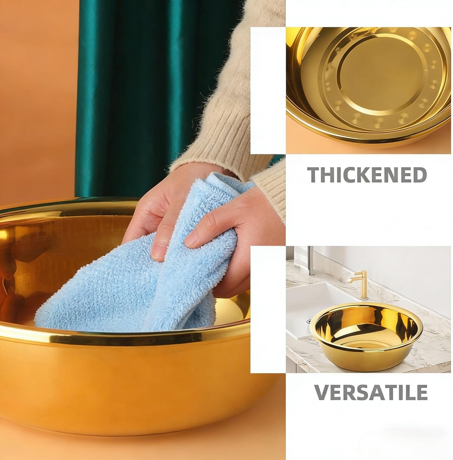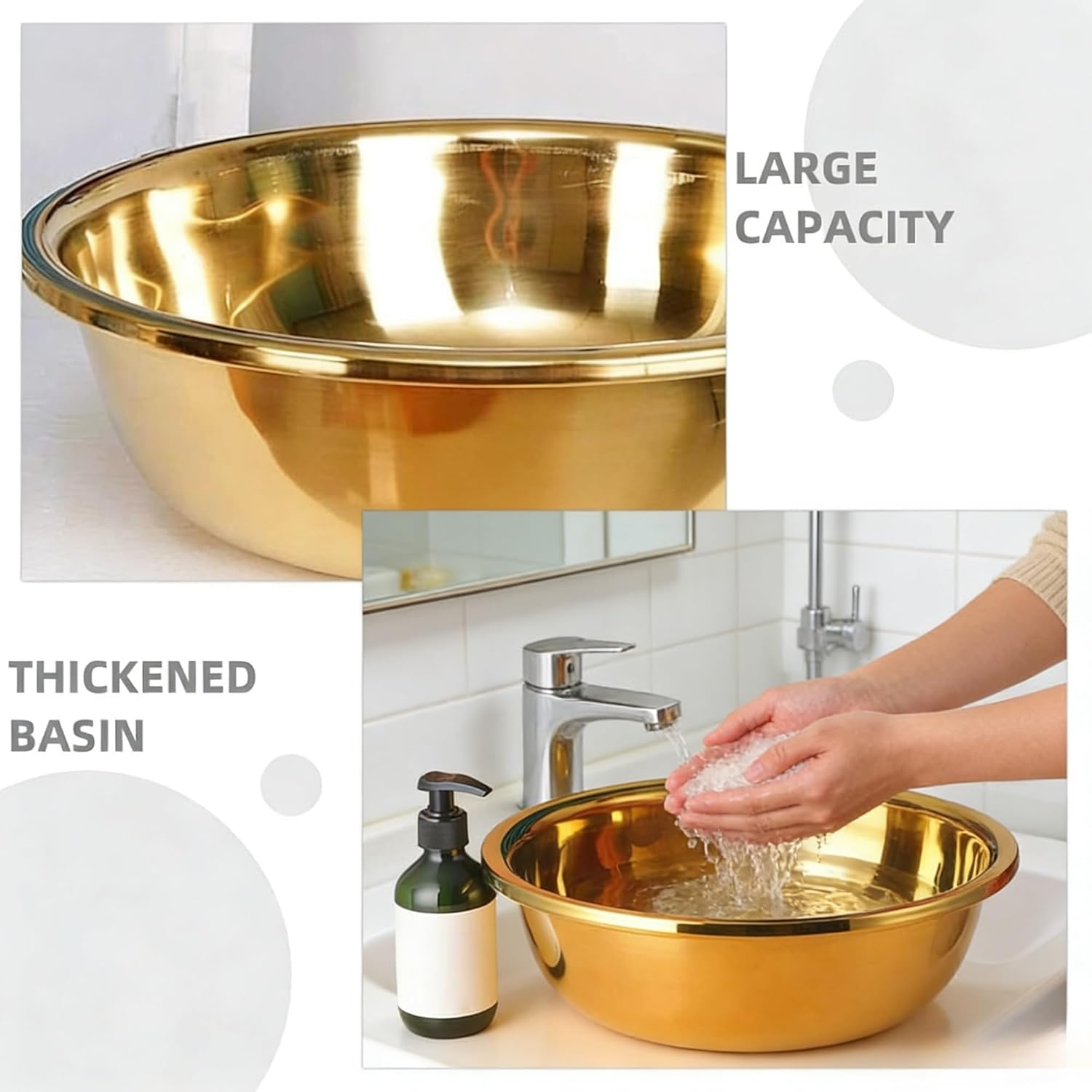 Upgrade your daily routine with a gold stainless steel mixing bowl designed for both kitchen and household use. This stainless steel basin features a thickened structure that supports a variety of tasks, from food preparation to general washing needs.With its spacious design, this large metal mixing bowl is suitable for mixing ingredients, rinsing vegetables, or handling larger quantities of food. The smooth interior surface helps reduce residue buildup and allows for quick cleaning, making it practical for frequent use.This gold mixing bowl also adds a modern touch to your space with its clean metallic finish. It can be used as a vegetable wash basin, dough mixing bowl, or even a personal wash bowl, making it a versatile addition to your home.Built for convenience, the rounded shape offers easy handling while the sturdy base helps keep the bowl stable during use. Whether in the kitchen or bathroom, this stainless steel bowl supports a wide range of everyday tasks.Specifications:Material: Stainless SteelColor: GoldDiameter: 12.6 inches (32 cm)Depth: 4.3 inches (11 cm)Design: Round Thickened BasinUse: Mixing, Washing, Food Prep, Household Tasks