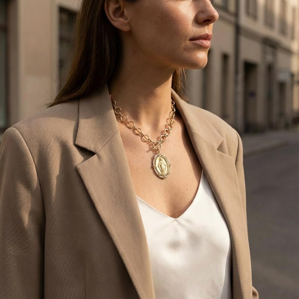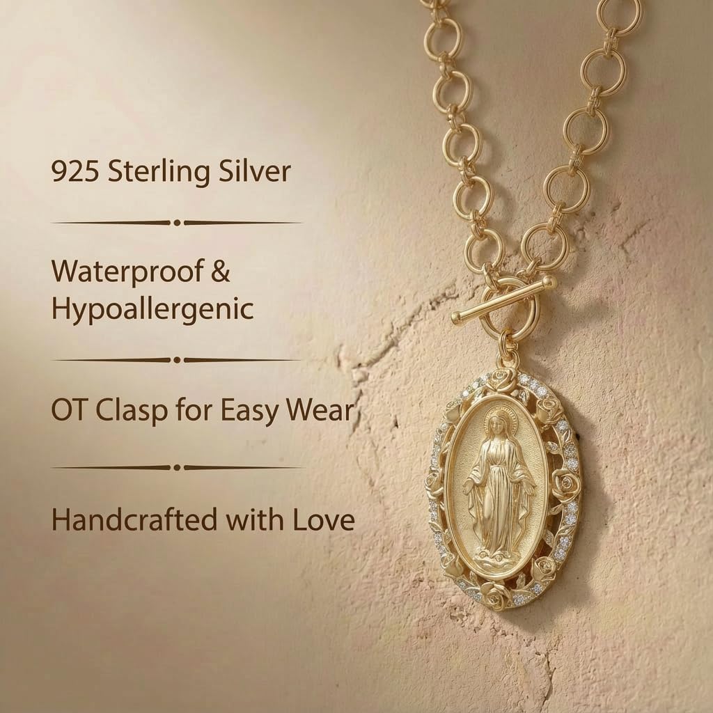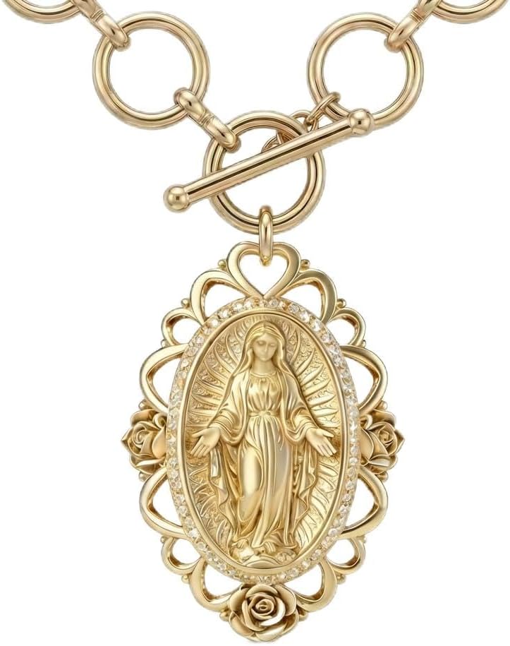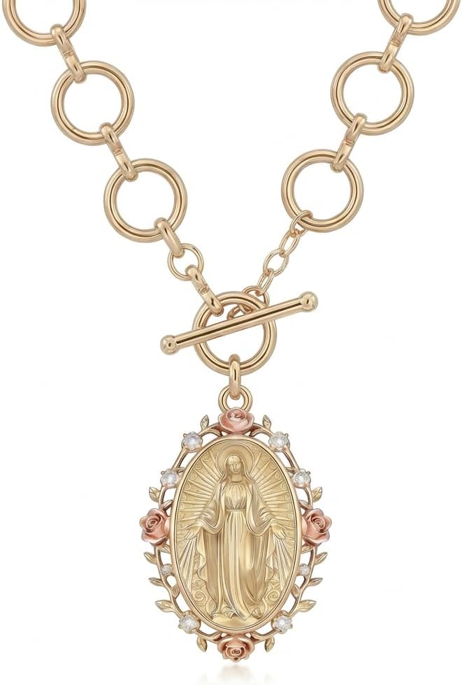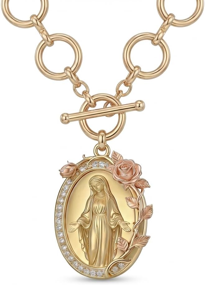 PinkBanni Gold Tone Virgin Mary Rose Necklace for WomenEmbrace divine grace and profound spiritual connection with our exquisite PinkBanni Gold Tone Virgin Mary Necklace. More than just jewelry, it's a tangible faith symbol, a beautiful Miraculous Medal pendant women will cherish. The revered Blessed Virgin Mary, depicted with grace, hands outstretched, lies at its heart. This Marian necklace for women is intricately framed by delicate roses, symbols of love and purity. Sparkling Cubic Zirconia stones add a radiant glow, transforming this into elegant devotional jewelry with roses. A gold oval pendant marrying classic religious artistry with contemporary elegance, it's a unique Women's Catholic necklace and a statement religious necklace. A secure toggle clasp pendant necklace ensures graceful wear. This Gold Madonna necklace, an ornate Catholic pendant for women, is a truly detailed Virgin Mary jewelry piece.Premium S925 Sterling Silver, Hypoallergenic & Durable DesignCrafted for enduring beauty, this Blessed Mother jewelry with CZ is made from authentic S925 sterling silver, renowned for strength. The lustrous gold plated finish provides the luxurious look of gold while ensuring exceptional durability. Our Catholic faith charm necklace is rigorously tested to be hypoallergenic, nickel-free, and lead-free, ideal for sensitive skin. Designed for everyday wear, it resists tarnish and maintains its radiant gold tone without irritation. This devotion to quality ensures your Mary necklace with CZ stones remains cherished for years, a truly Protective Mary Necklace and Gold Tone Virgin Mary Necklace. You'll love this Gold chain Virgin Mary pendant.The Perfect Christian Jewelry Gift for HerSearching for a truly meaningful Christian jewelry gift? This Graceful Virgin Mary pendant necklace is ideal for expressing faith and love, presented in a beautiful gift-ready package. It serves as an unforgettable Confirmation necklace