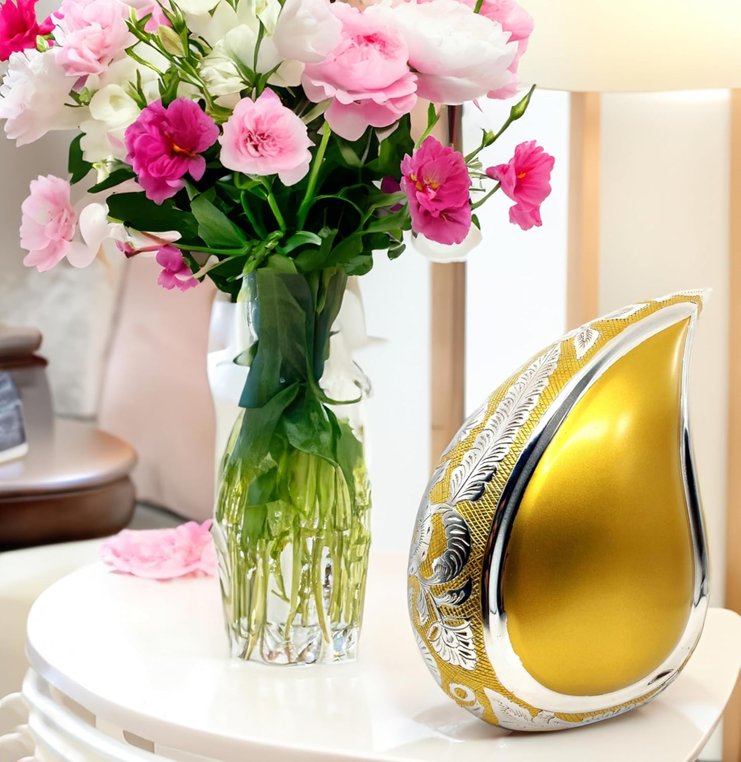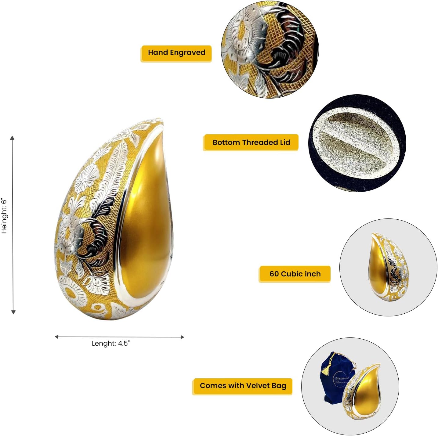 Golden Teardrop Urns for Human Ashes, Funeral Cremation Urn with Velvet Bag, Keepsake Urn for Adults, Size 6 inch