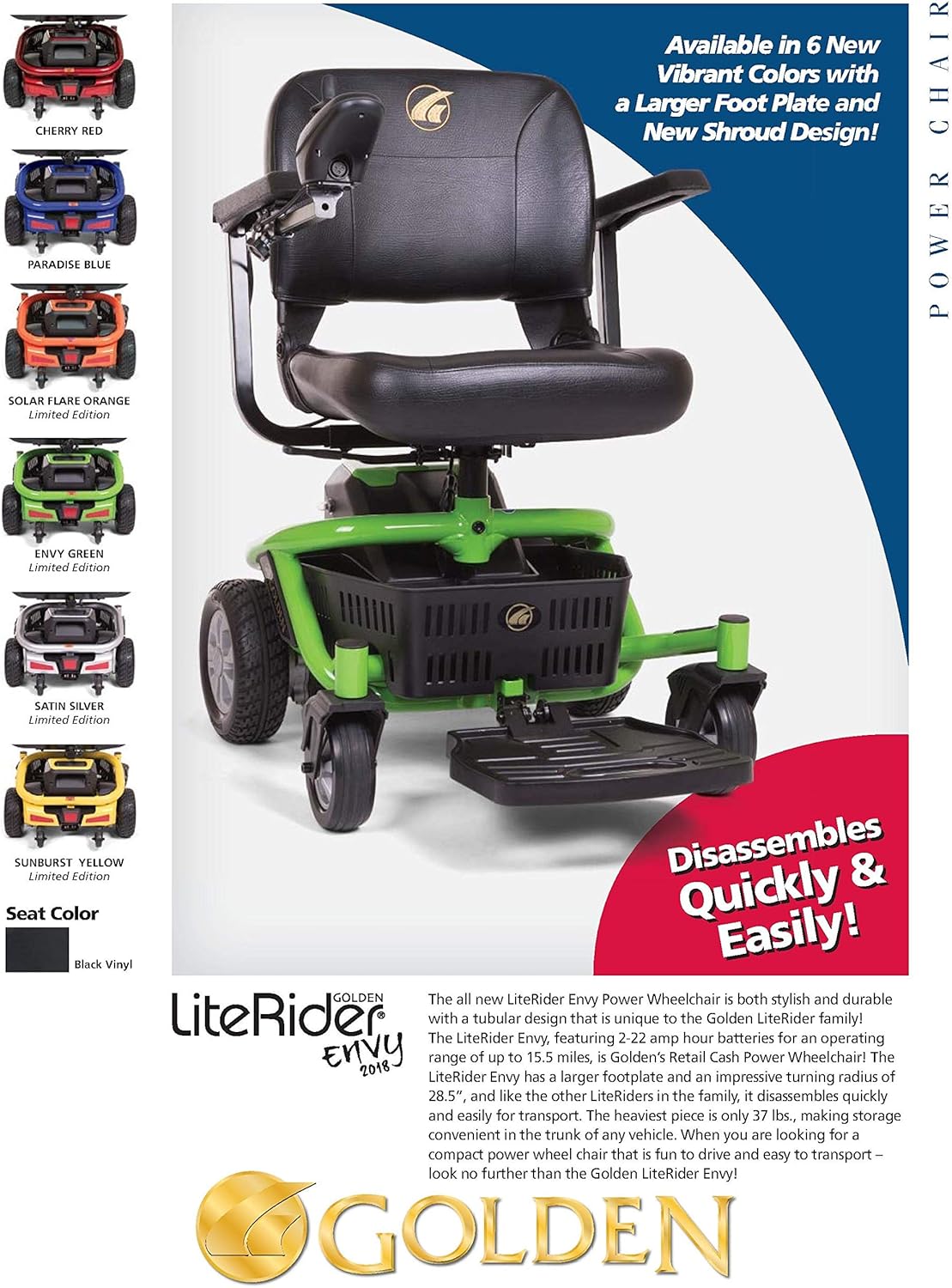 The world’s lightest, most transportable and maneuverable power chair is the Golden LiteRider Envy GP162! Now available in Cherry Red. Designed with the end-user and their caregivers in mind, the LiteRider Envy can be disassembled in just seconds to easily fit in the trunk of virtually any car. The heaviest piece weighs only 35 lbs to easily be lifted into the back of a vehicle. The LiteRider Envy offers a comfortable ride all day long, with a stadium-style seat and a generous footplate, plus bigger 22 amp hour batteries so you can go further than ever before! When you’re looking for a compact power chair that’s easy to transport and fun to drive, look no further than the Golden LiteRider Envy!