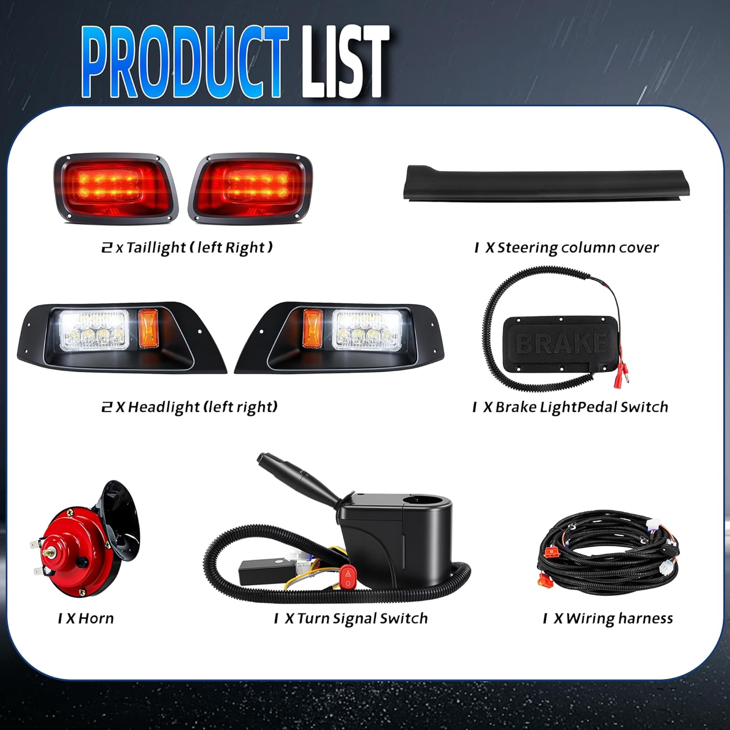 | Included Components | 2x headlights, 2x taillight, 1x horn, 1x turn signal lever with headlight/horn switch, 1x steering column cover, 1x brake pad, 1x wiring harness, 1x mounting screw set, 1x installation manual |