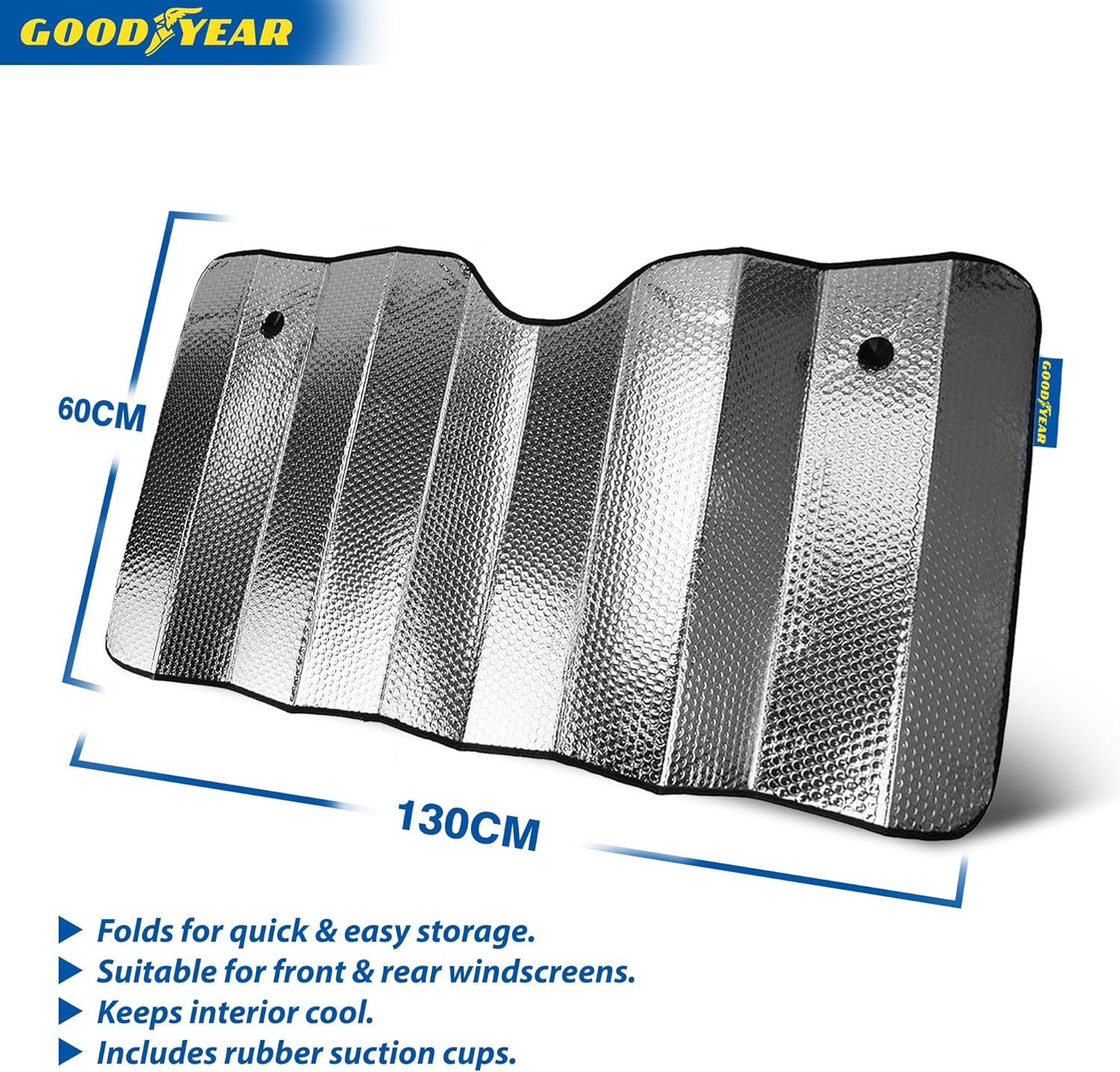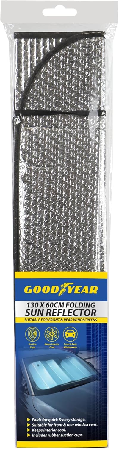 Goodyear Heavy Duty Folding Car Sun Reflector - Features: - Folds for quick and easy storage - Helps to keep your car interior ultra cool during the summer as it deflects 100% of the sunlight - Prevents dashboard from discolouring and lifting from the suns rays - Suitable for both front and rear windscreens (please note only one is included) - Rubber suction cups ensure it's firmly stuck to the windscreen - Folds for quick and easy storage - Dimension: 130 cm x 60 cm to cover the entire windscreen
