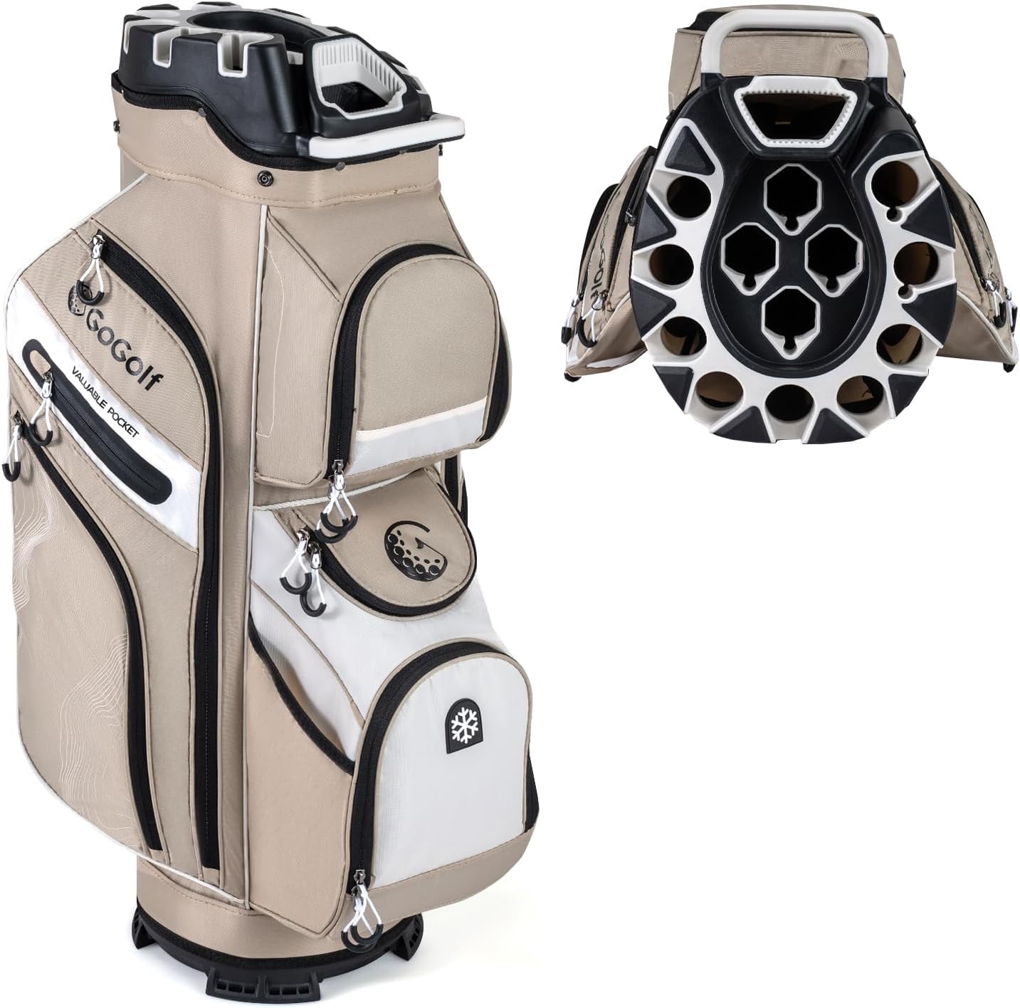 Description:Step onto the green with confidence with this 14-way golf cart bag.Designed with a 14-way molded lock top with full-length dividers, this golf bag offers excellent organization and separation of your clubs, ensuring they are securely held and easy to access. It features a total of 11 pockets, providing ample space for all your essential accessories. These include 2 lined valuables pockets to keep personal items safe and a cooler bag to keep your beverages chilled throughout the day. Crafted to cater to every golfer's needs, this golf club bag is lightweight and comes with a padded strap and multiple handles, making it effortless to carry around the golf course. Additionally, the golf bag includes a towel ring, glove holder, pen pouch, rain hood and umbrella holder for convenient use.Features:14 full-length top dividers with molded locks secure all clubs in place Adjustable padded shoulder strap for comfortable carrying Top handle and non-slip handle for easy transportationRain hood for tidy storage and all-around protection Umbrella holder keeps you prepared for all weather Multiple pockets make storage a breeze 2 soft lined pockets keep valuables well protectedHand y towel ring, glove holder and pen pouchExtra strap organizer helps reduce clutterStable round base prevents tipping overSuitable for various golf cartsSpecification:Color: Black+Red/Black+White/Grey+Dusty Pink/Grey+Navy/Purple+GreyMaterial: Polyester Fabric, PlasticBag Height (with Rain Hood): 50"/127 cm Bag Height (without Rain Hood): 35.5"/90,5 cm Top Dimensions: 13.5" x 9.5"/34 cm x 24 cm (L x W)Base Dimensions: 10.5" x 10.5"/27 cm x 27 cm (L x W)Net Weight: 5.7 lbs/2.6 kgPackage Includes:1 x Golf Cart Bag1 x Rain Hood