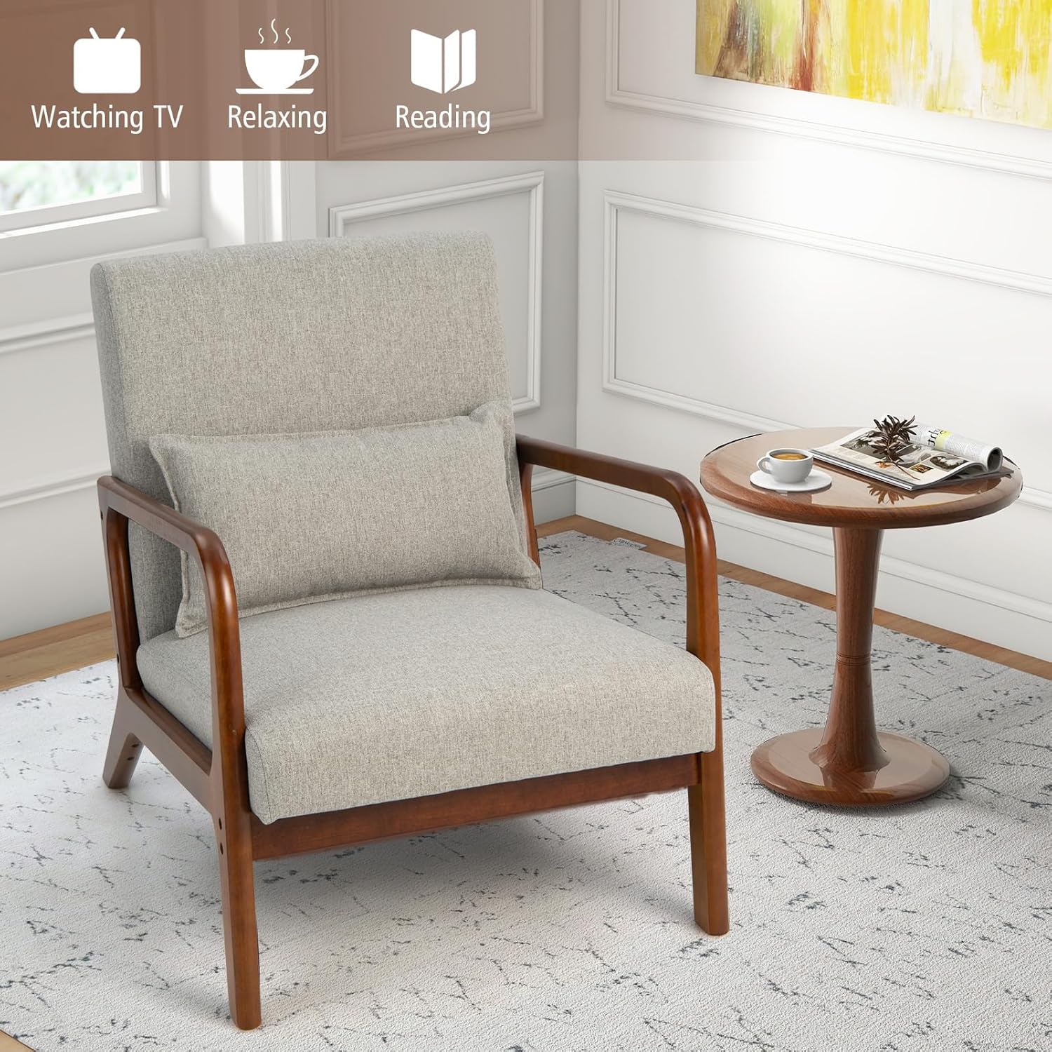 DescriptionThe GORELAX armchair has a mid-century look without losing any of its modern comfort. The wide seat cushion and soft backrest give you absolute warmth and comfort. Whether you are reading, watching a film or taking a nap, it is your best choice. As well as in your home, it can be used as a bright decoration in your lounge or reception area.FeaturesFelt foot pads protect floor from scratches.Extra pillows for comfortable lumbar support.Sturdy rubber wood frame can can bear a weight of 330lbs.Humanized backrest and armrests contribute to body relaxation.Ideal for creating a cozy atmosphere in living room, offices and more.Elastic support system offers stability and maintains a consistent appearance.Thick seat cushion filled with high-density sponge for a comfortable sitting feel.SpecificationsColor: Beige/GreyMaterial: Rubber Wood, Polyester Fabric, SpongeOverall Dimension: 31" x 25.5" x 30.5"/ 79 cm x 65 cm x 77 cm (L x W x H)Seat Size: 23.5" x 22"/ 60 cm x 56 cm (L x W)Pillow Size: 18.5" x 13"/ 47 cm x 33 cm (L x W)Load Capacity: 330 lbs/ 150 kgNet Weight: 24 lbs/ 11 kgPackage Includes1 x Accent Chair1 x Lumbar Pillow1 x Instruction