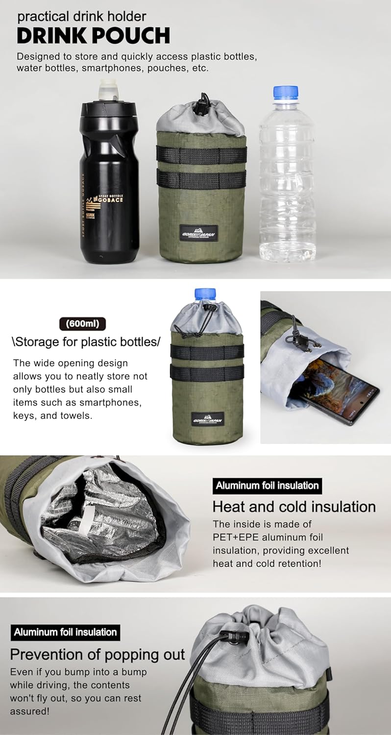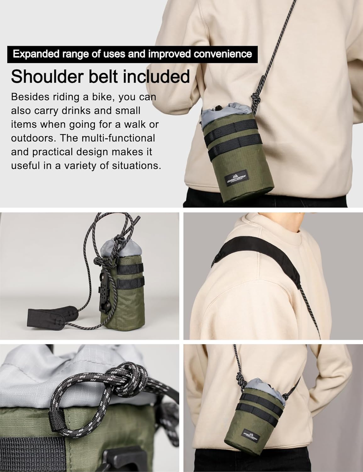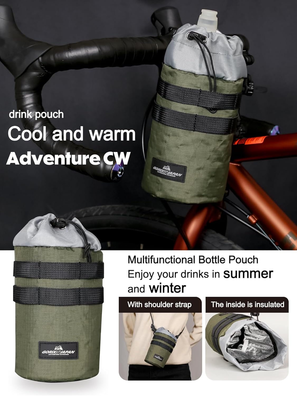 [Product Contents] Insulated drink pouch [Size] Height 20.5-15.5cm, outer diameter φ10cm [Weight] Approximately 150g [Material] Outer material / 1000D nylon + polyester fiber, Inner layer / Foam cushioning material Chinjumen thickness 6mm Inner lining / Insulating aluminum foil [Compatible bottles] Bottles with a diameter of 8cm and a height of 19cm or less can be used [Specifications] Insulating effect / Dedicated bracket fixing / Water-repellent outer material [Use] 2-way design for bicycle drink bag and shoulder bag [Color] Khaki The bracket may not be compatible with some bicycles. Please check the bracket size and the shape of your bicycle before purchasing. ● Drink pouch to be attached to bicycle ● Securely fixed with a dedicated bracket ● Can be securely fixed with a sliding magnet type ● Multiple belt loops to accommodate various types of bicycles (please prepare a separate belt or Velcro if necessary) ● The inside of the bag is insulated with aluminum foil for a "heat retention" effect! ●For storing standard 500ml plastic bottles and 500ml to 600ml cycle bottles ●Can also store smartphones, wallets, keys, and other items other than bottles ●Adjustable drawstring prevents contents from spilling out ●Water-repellent outer material makes it safe to use on rainy days ●Material is highly durable and waterproof, making it easy to handle ●Comes with a shoulder strap, making it a 2-way drink holder and bag ●Simple and stylish design goes with any style ●Makes effective use of free space in an easily accessible location ●Easy to carry drinks and small items when walking or outdoors ●Highly durable, perfect for everyday use as well as outdoor and active scenes [Cold and heat retention effect] The inside of the bottle pouch uses aluminum foil insulation to keep the temperature of drinks for a long time. The cold and heat retention effect lasts for about 3 to 5 hours, so you can comfortably enjoy cold drinks in the hot summer and warm drinks in the cold winter. It is also compatible with 500ml plastic bottles and thin water bottles, and comfortably supports hydration while cycling. It is a convenient item that can be used in any season. [Can store more than just bottles] The wide caliber design allows you to neatly store not only bottles but also small items such as smartphones, keys, and towels. If you put in some supplemental food or energy bars, you can smoothly replenish your energy while riding. It is easy to store 500ml plastic bottles and slim water bottles, so you can use it flexibly depending on the scene. In addition, it comes with an adjustable drawstring, so you can rest assured that the contents will not fly out even if you hit a bump while riding. You can keep all the items you need together, so you can manage your luggage while cycling much more comfortably. [High durability & tough material with waterproof specifications] Made of 1000D nylon material with excellent durability and waterproofness so that you can use it for a long time. It is resistant to tearing, friction, and abrasion, and is a tough design that is safe for traveling by bicycle and daily use. It can also handle sudden changes in weather. *It is not completely waterproof, so please be careful when using it in heavy rain. The durable and functional material firmly supports a comfortable ride. [Mount plate system] A dedicated bracket and mount plate are used to realize a system that can be easily and securely attached and detached. By installing a mounting plate between the bracket and the bag, you can smoothly remove only the bag. In addition, the locking function ensures that the bag is firmly fixed even when it vibrates while riding, ensuring safety. The bag has multiple belt loops, making it compatible with various types of bicycles. (Please prepare a separate belt or Velcro if necessary.) [2-way design] A convenient 2-way design that can be used not only as a drink holder, but also as a shoulder bag with a shoulder strap. It is extremely easy to use, as it can be used as a bottle pouch when riding a bicycle and carried over the shoulder after getting off. It is a practical item that can be used for multiple purposes regardless of the scene, such as walking pets, outdoor activities, and as a sub-bag when traveling. With this one item, you can carry your luggage comfortably in various scenes other than cycling. [Compatible with various bicycles] Designed to be attached to the stem, it is compatible with a wide range of bicycles. The bracket is designed to be installed vertically, allowing for stable fixation. It is compatible with various models such as folding bicycles, mini velo, road bikes, cross bikes, and mountain bikes. In addition, when installing on a road bike, cross bike, or other bike with a short stem, you can use the belt loop on the bag and use Velcro or other tools to secure it firmly. It can be used comfortably in any situation, from everyday use to long rides and outdoor activities.