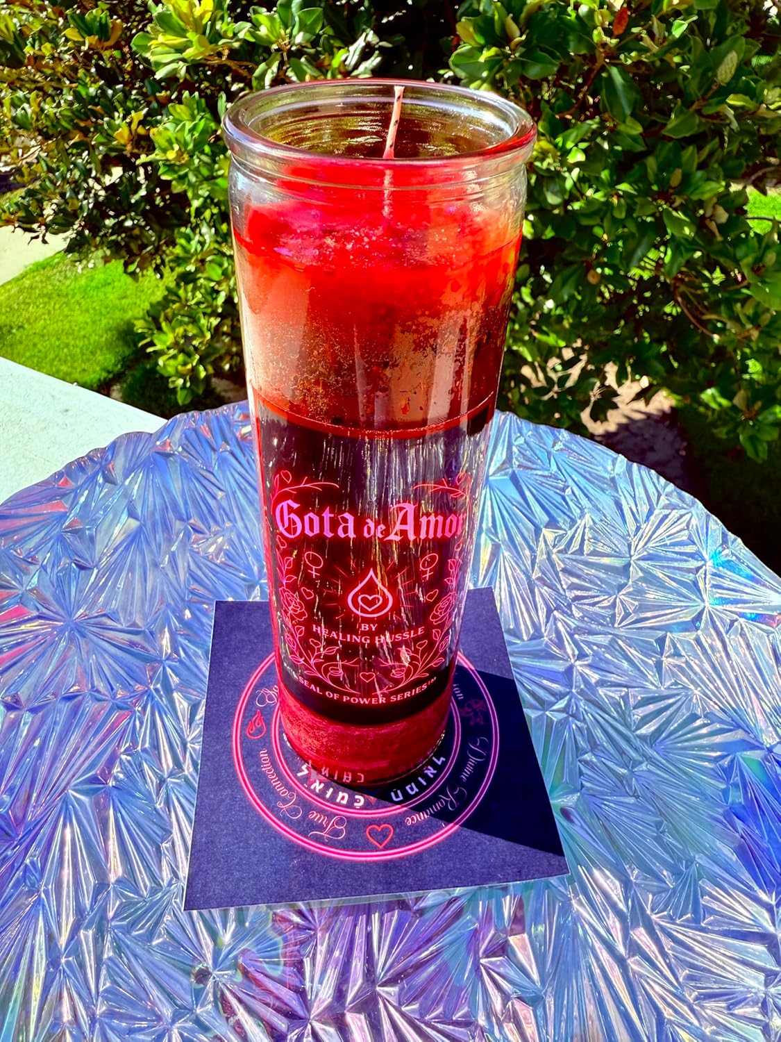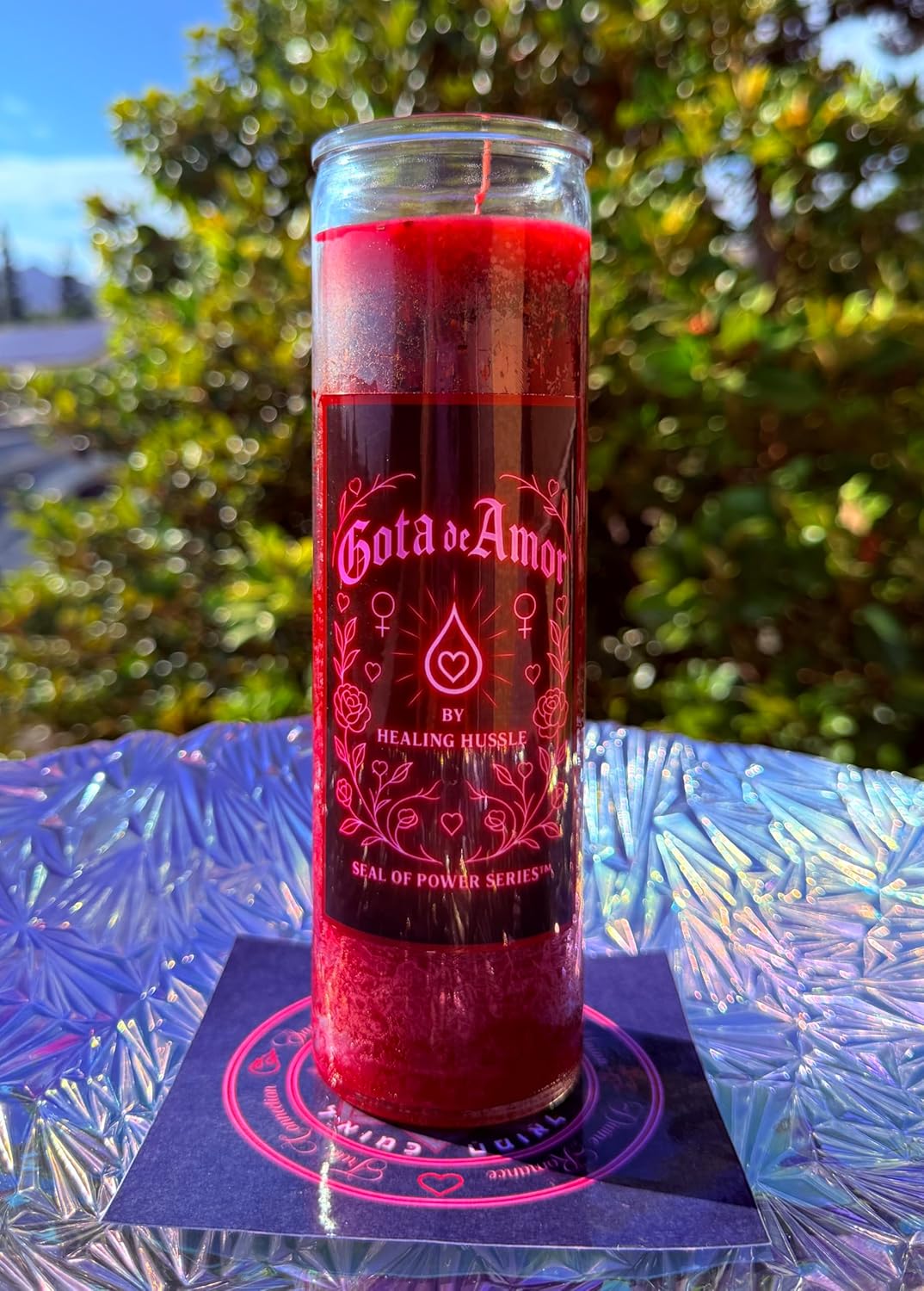 Gota De Amor Seal Of Power Candle Kit..... is created to emotionally connect, inspire romance, and bring heart-centered energy into your space. This handcrafted red candle supports love-focused intention, emotional closeness, and meaningful connection. Created as part of the Healing Hussle Seal Of Power Series, it combines symbolic seals, infused elements, and intentional design in one elevated candle kit. Each candle is hand-poured and finished in Los Angeles, California in small batches. It is infused with Rose Quartz energy and sacred love resins traditionally associated with affection, harmony, and romantic focus. Every Gota De Amor Candle Kit includes Two Full-Color Seal Print Designs, Two Matching Vinyl Seal Stickers, and Printed Candle Instructions. The seals are exclusive Healing Hussle artwork and are designed to be used alongside candle lighting, meditation, or personal intention setting. Gota De Amor is ideal for creating a loving atmosphere, supporting romance, or working with reconciliation and heart-centered focus. It also makes a meaningful gift for Valentine’s Day, anniversaries, or spiritual spaces. This 8-inch glass candle is made to order, not mass produced, and designed for decorative, meditative, and spiritual use.