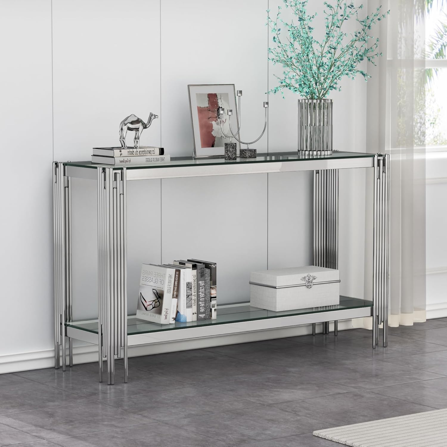 47 inch Modern Glass Coffee Table Specification Color: Black Glass, Gold frame Materials: Tempered Glass, Stainless Steel Table Dimension: 47.24''L x 25.59''W x 17.72''H Table Net Weight(pc): 77.29 lbs Weight capacity hold up to 200 lbs Package includes: 1x Coffee Table Number of Package: 2