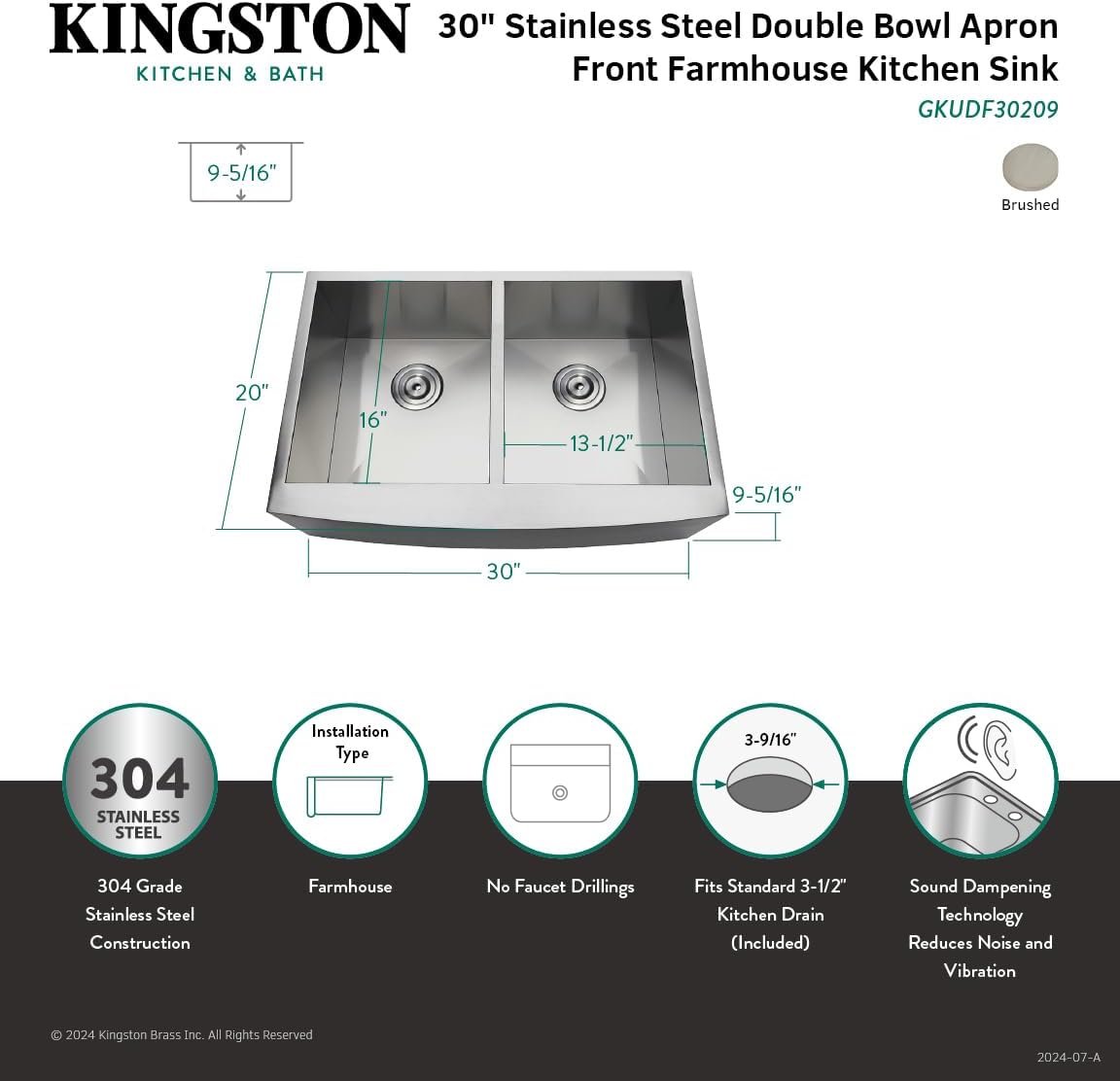 Exquisitely styled for your taste, this sink will enhance your kitchen living space. Farmhouse sinks have an apron front that causes the sink to be the centerpiece of kitchen design. This unique feature prevents water spillage on cabinetry while adding aesthetic appeal. The Uptowne stainless steel double bowl farmhouse kitchen sink in particular, is constructed from high quality 304 grade rust-resistant stainless steel. The brushed finish is also resistant to scratches, and with the sink's sound dampening technology, sound and vibrations are reduced. Perfect for organizing, separate fruits and vegetables that need washing from dirty dishes, or allow dishes to dry on one half and be washed on the other with the provided double bowl. Allow this farmhouse sinks to impeccably complete your styled kitchen.