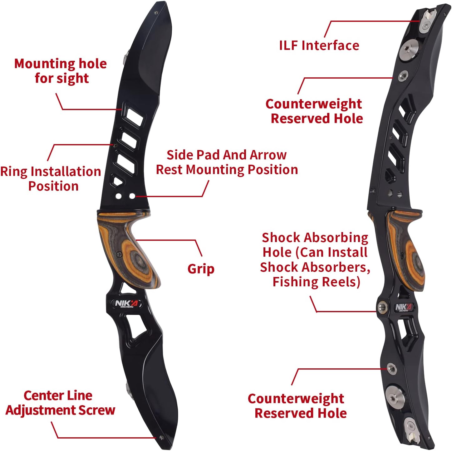 Riser Length: 21 inch For: RH shooter Material: Magnesium Alloy Body, Powder Polish Package Including: 2 pcs Limbs Bolts + 4 pcs Machine-Processed Rice Screws + 2 pcs M16 Screws +2 pcs Alignment Plates + 1 pc Handle +1 pc Black Silicone Arrow Rest + 3 Allen Keys Features: 1. General purpose for athletics, shooting, hunting, and it is one of the best choices for primary shooter. 2. Terse and forceful and its comfortable for using. 3. Precise for shooting.