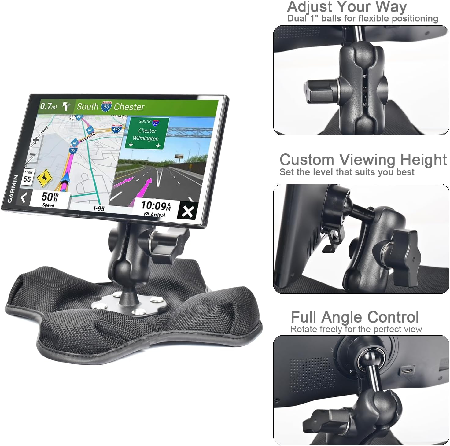 The VAUBORTTI GPS Dashboard Beanbag Mount provides a stable and convenient solution for securing your navigation device while driving. Designed with a weighted beanbag base and a non-slip bottom, it sits firmly on your dashboard without the need for drilling, suction cups, or adhesives. This mount features a B Size 1" ball system paired with a sturdy aluminum double socket arm, ensuring a reliable hold and allowing full 360° adjustment for the best viewing angle. The included 25mm to 17mm adapter makes it versatile, enabling connection to GPS devices that use the 17mm socket standard. Compatible with a wide range of Garmin devices, this mount supports Drive, DriveSmart (except 86), Nuvi, and Dezl models with a 17mm socket. It serves as a practical replacement for suction cup or vent mounts, offering enhanced stability, easier adjustment, and improved visibility.