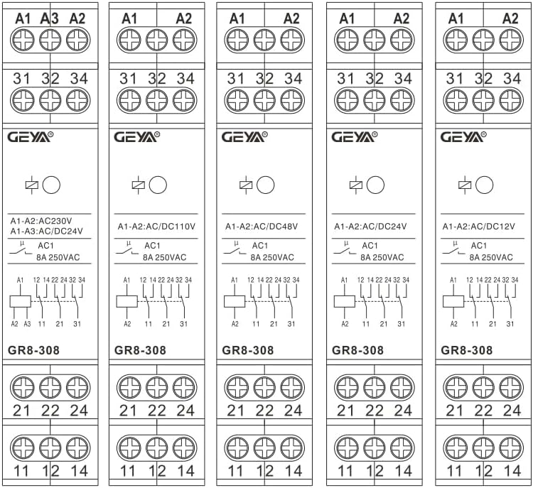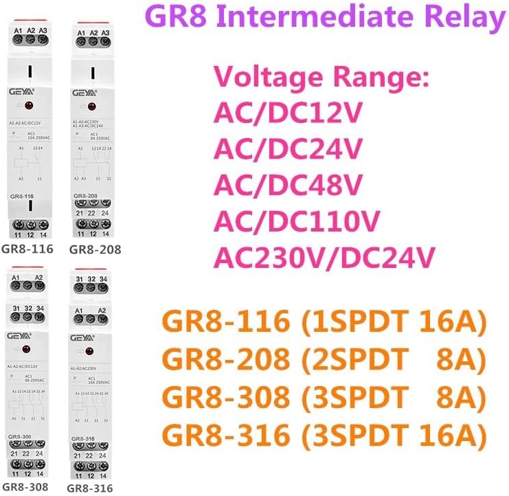 relayGeneralApplications-intermediate relay used for switching larger load output, strengthen or multiplying contacts of the existing device.Function Features-Voltage range: AC/DC12V,24V,48V,110V,AC230V.-relays GR8-316 enable connection to a 3-phase circuit.- Relay status is indicated by LED.- 1-MODULE,DIN rail mounting.