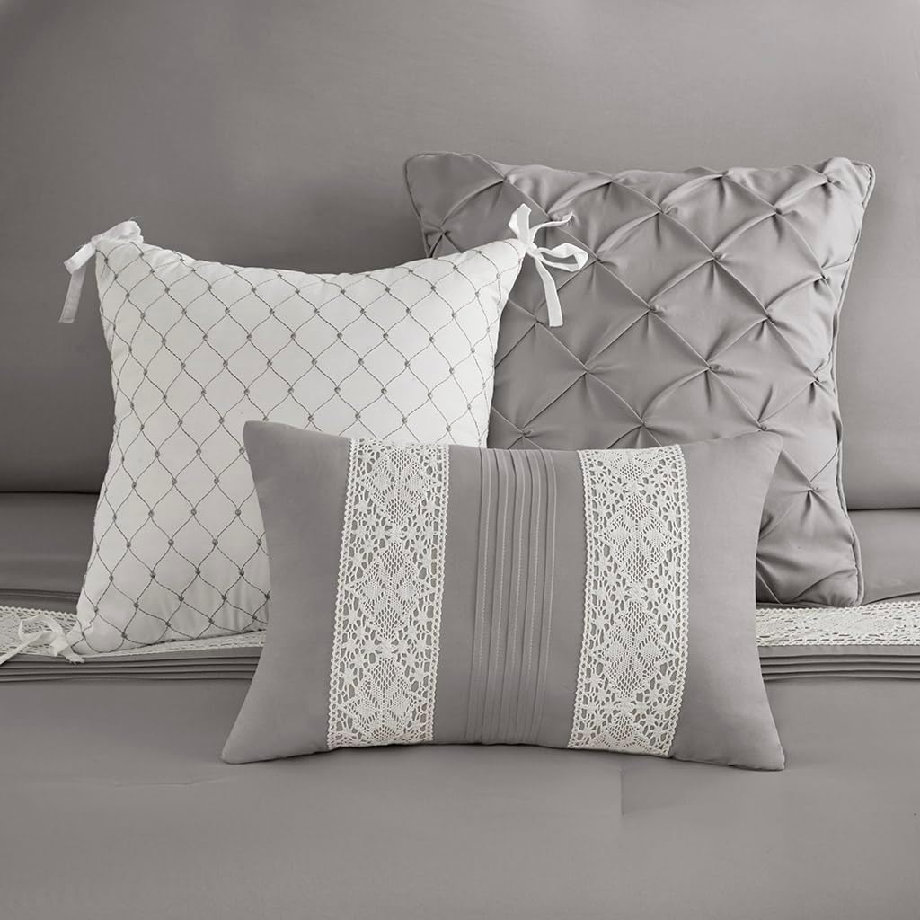 Enhance your bedroom with this 7-piece farmhouse comforter set. Featuring white lace trimming, pintucks, and three decorative pillows with different techniques, it offers style and practicality with 100% hypoallergenic polyester filling and machine washable microfiber. Care Instructions: Machine washable, spot clean pillows