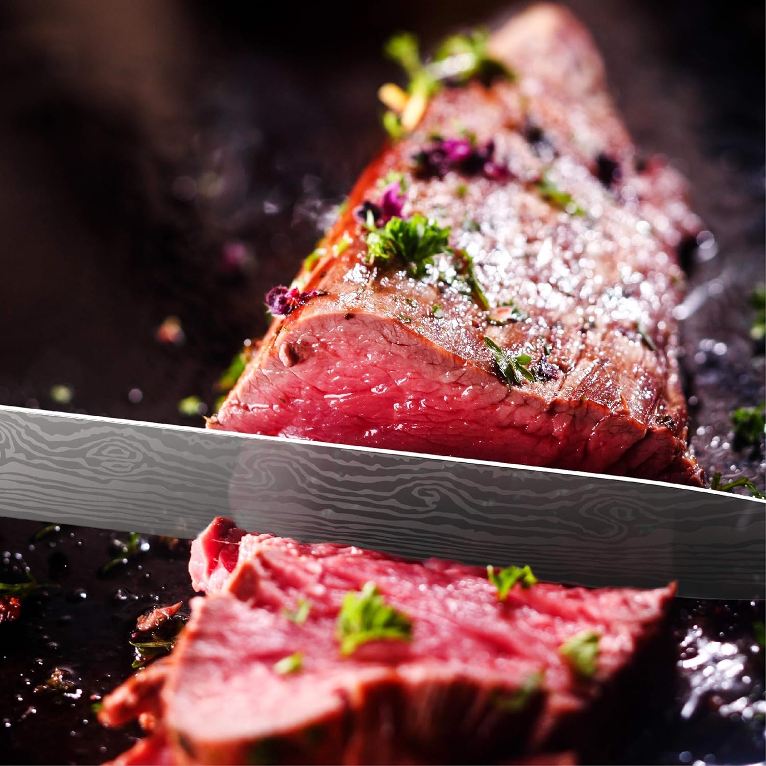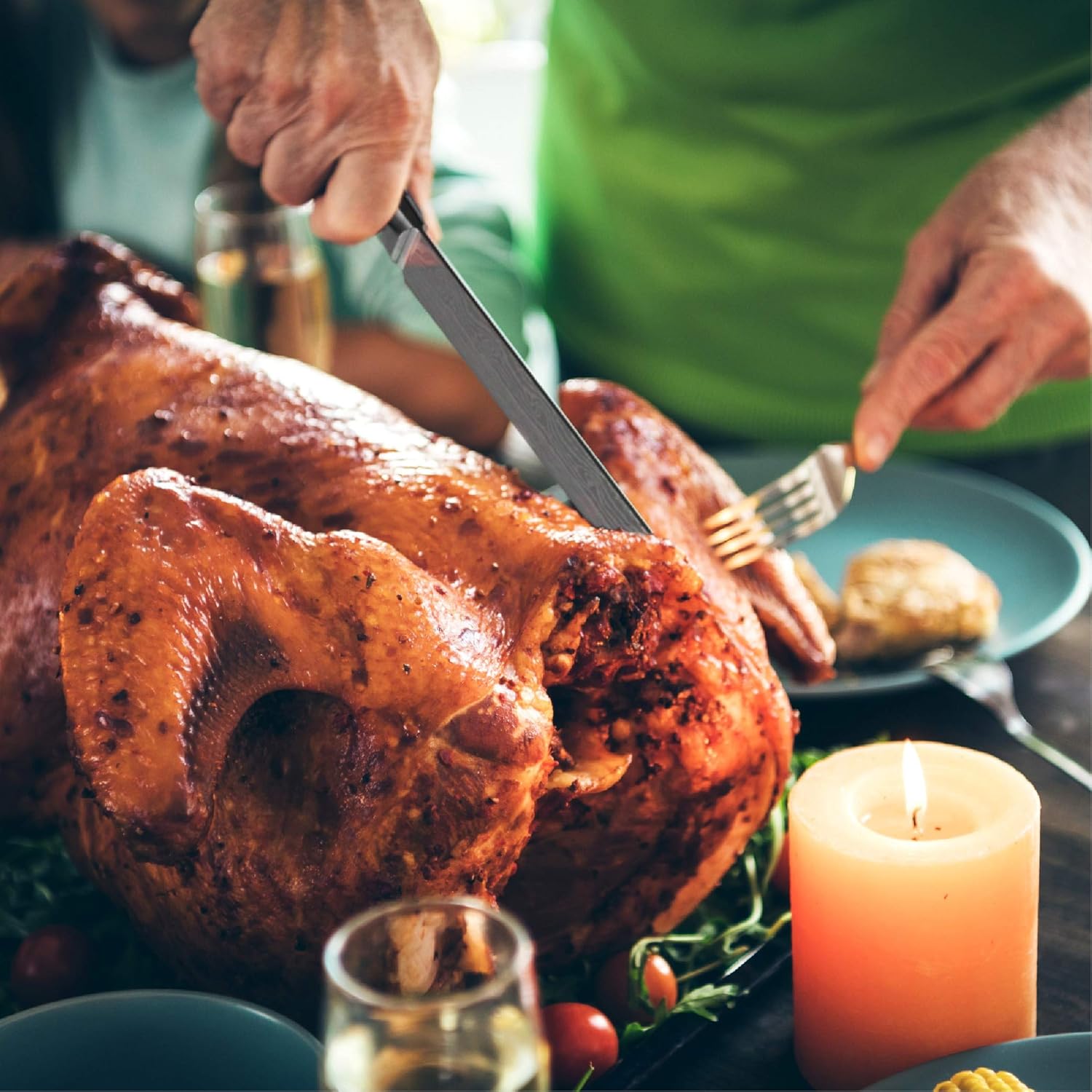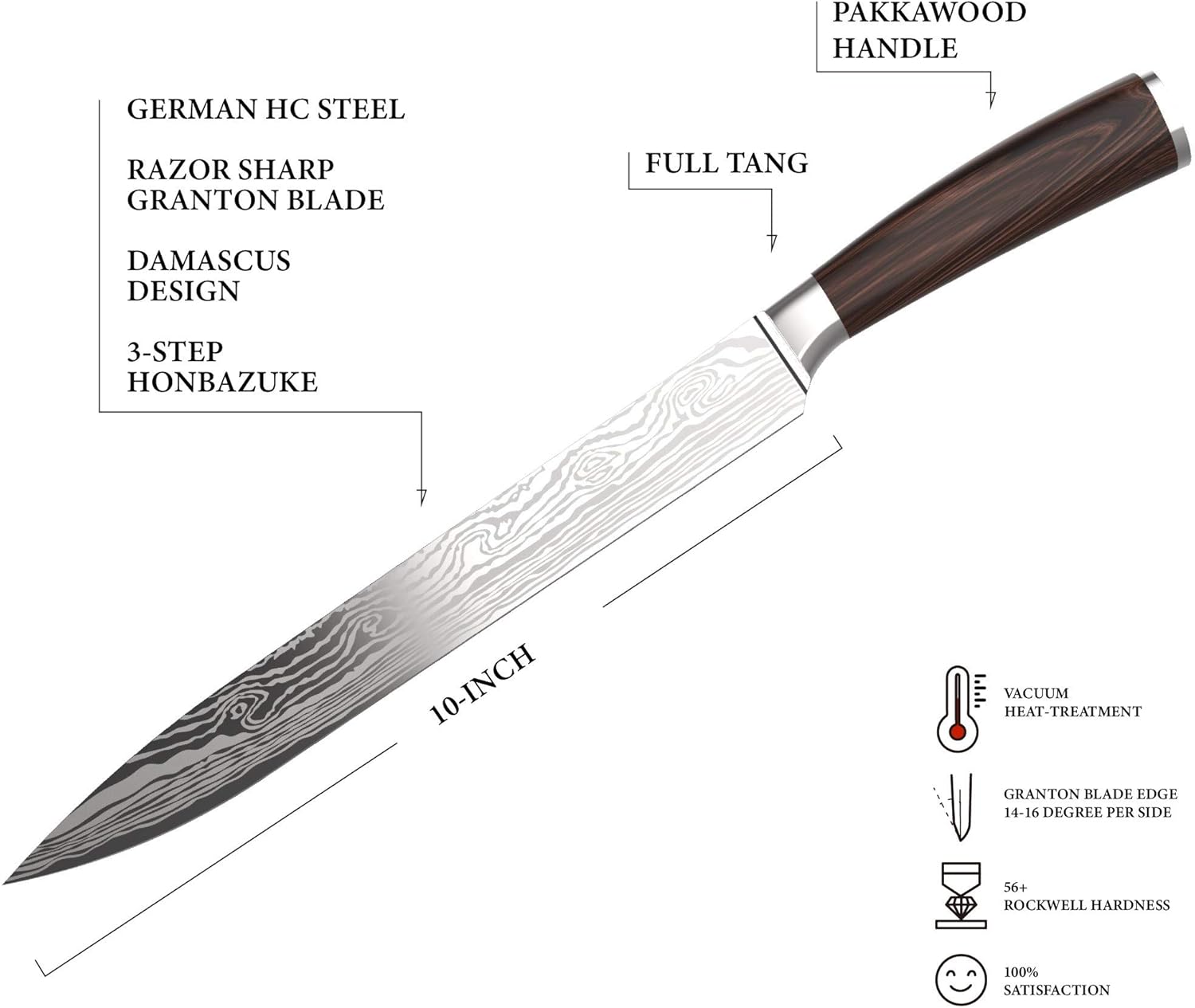 "At GRANDTIES, we are committed to using high-quality materials for our products. Safety and craftsmanship are our top priority. Our professional razor-sharp 10” Carving knife is made from High Carbon German stainless steel with a Rockwell hardness rating of HRC56.This Damascus blade will slice any meat, fish, roasts, turkey, chicken, brisket, pork loins, ham, fruits, vegetables, bread, and cakes with ease and precision. The well-balanced full tang design with a protective bolster and luxurious wooden handle offer absolute stability and great comfort. This beautifully crafted slicing knife makes the perfect appreciation gift for your loved ones on any special occasion."
