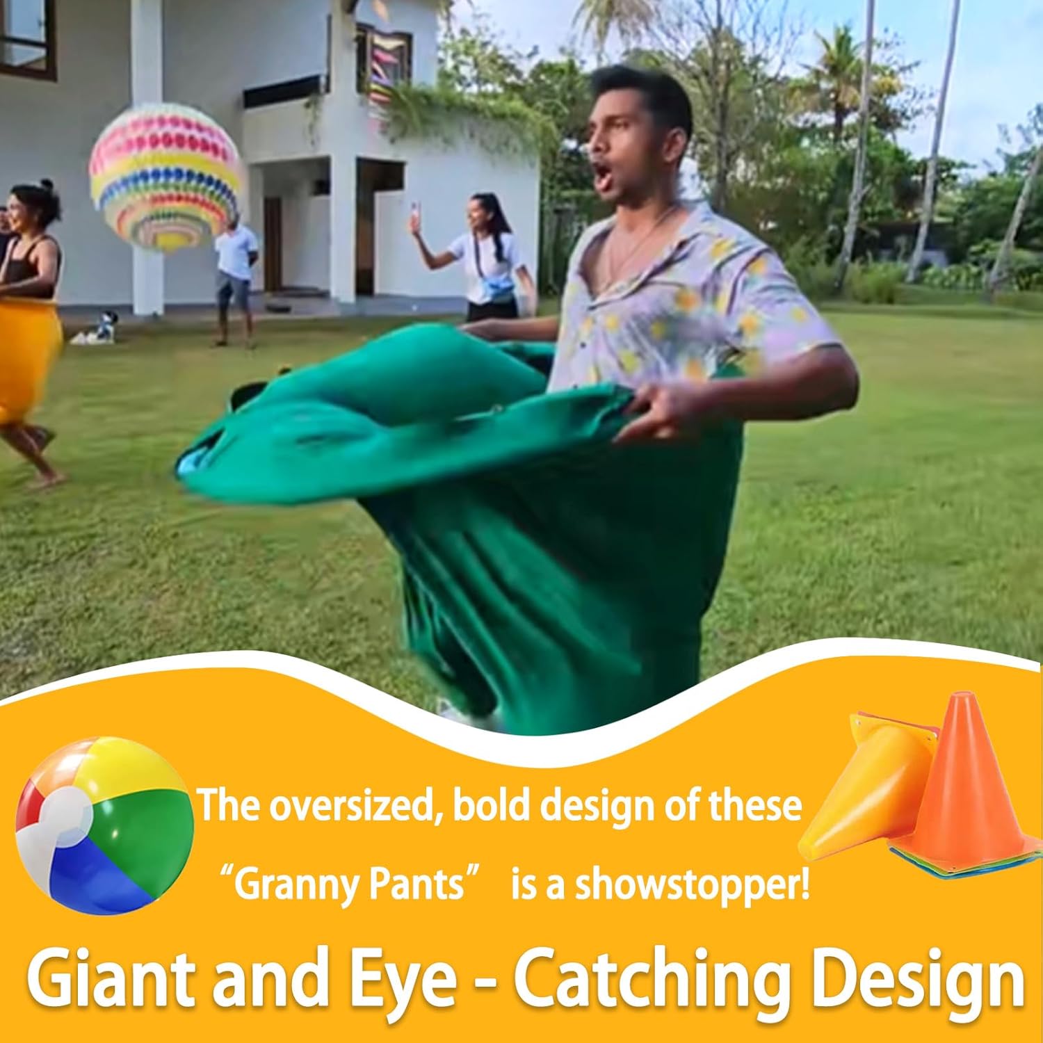 Granny Pants Outdoor Game, Oversized Granny Pant Yard Game for Adults, Super Pants Challenge Games with Balls, Family Reunion Games Key Features: ✔ Ice-Breaker Hit: Instantly brings energy and humor to any gathering. ✔ One-size-fits-most – Stretchy fabric accommodates various body types ✔ Easy to clean & portable – Quick cleanup and compact storage ✔ Durable materials – Built to withstand energetic gameplay Specification: Name: Oversized Pant Yard Game Material: Cloth Color: Green, Red, Blue, Yellow Package includes: 2 x Granny Pants Yard Game 6 x PVC Ball(8.66 In) 1 x Pump Note: Slight size variations may occur due to manual measurement. Colors may differ slightly from images due to monitor settings. Have questions or issues? Contact us—we’re happy to help!