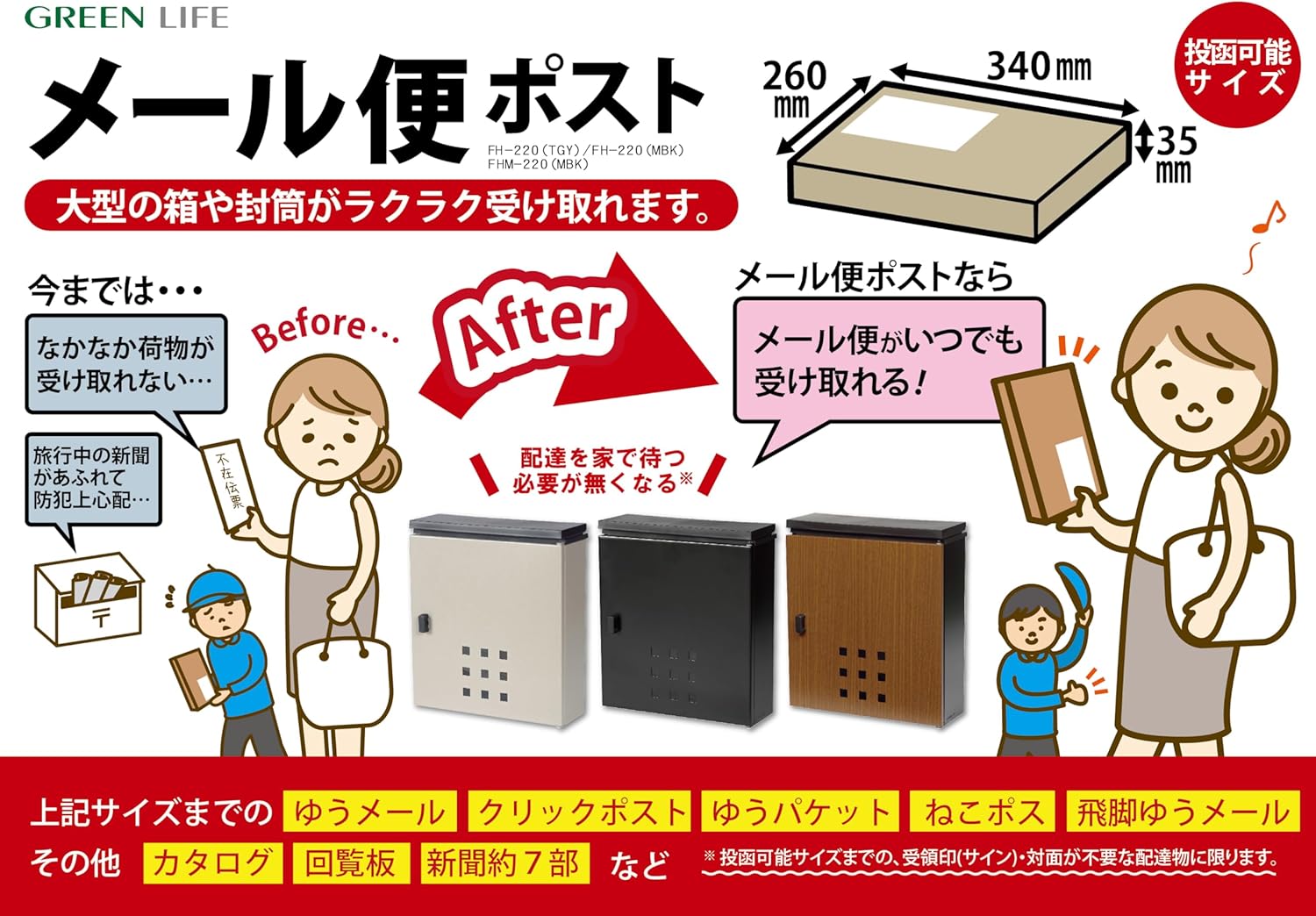 You can also receive mail mail within 13.4 x 10.2 x 1.4 inches (34 x 26 x 3.5 cm). The vertical design allows for space saving on the left and right side. No matter where it is installed. Side opening for easy access to mail Simple design matches your home. The bottom has a stopper for mail items, and is designed to prevent falling and easy to take out your items. With a check window, you can see if there is a mail or not.