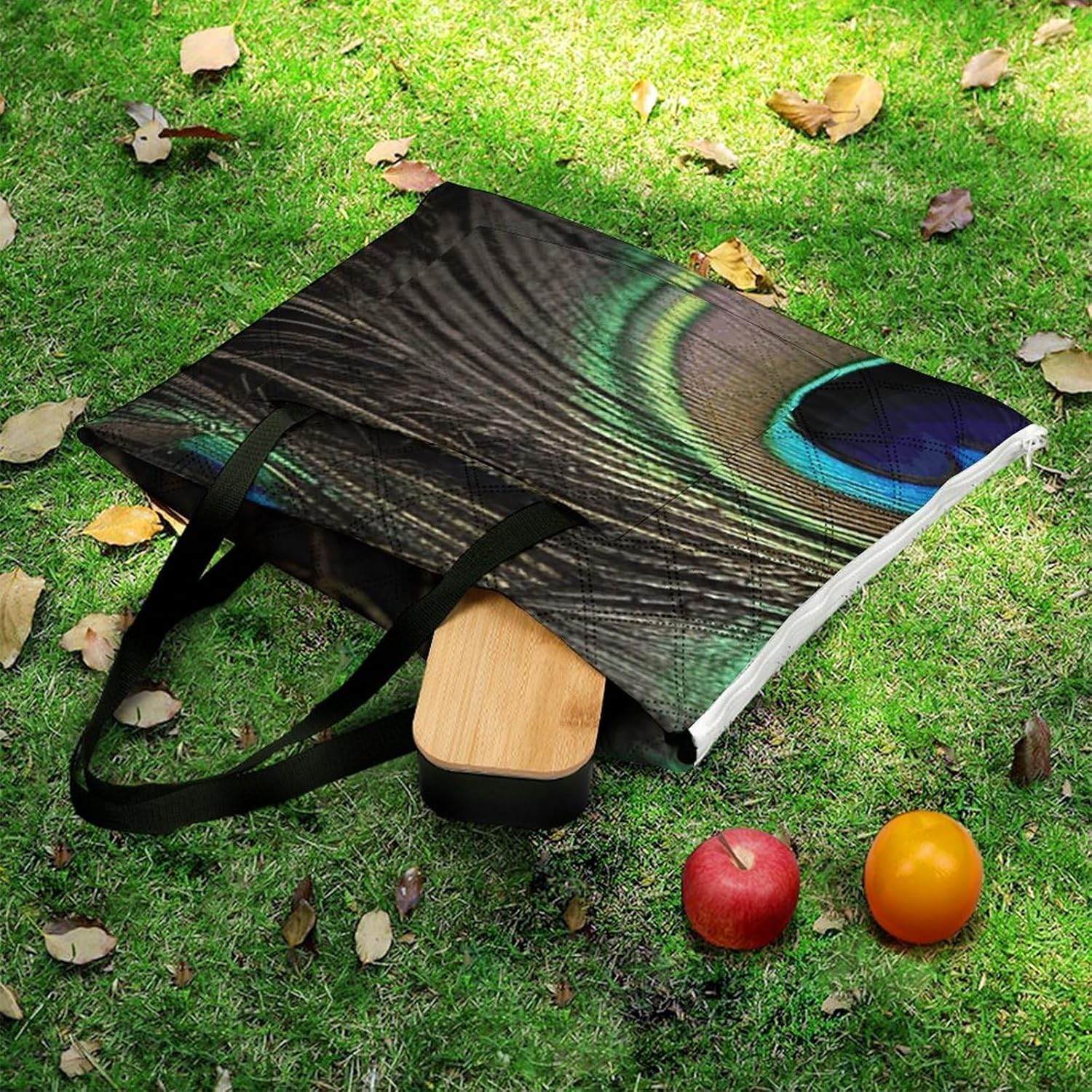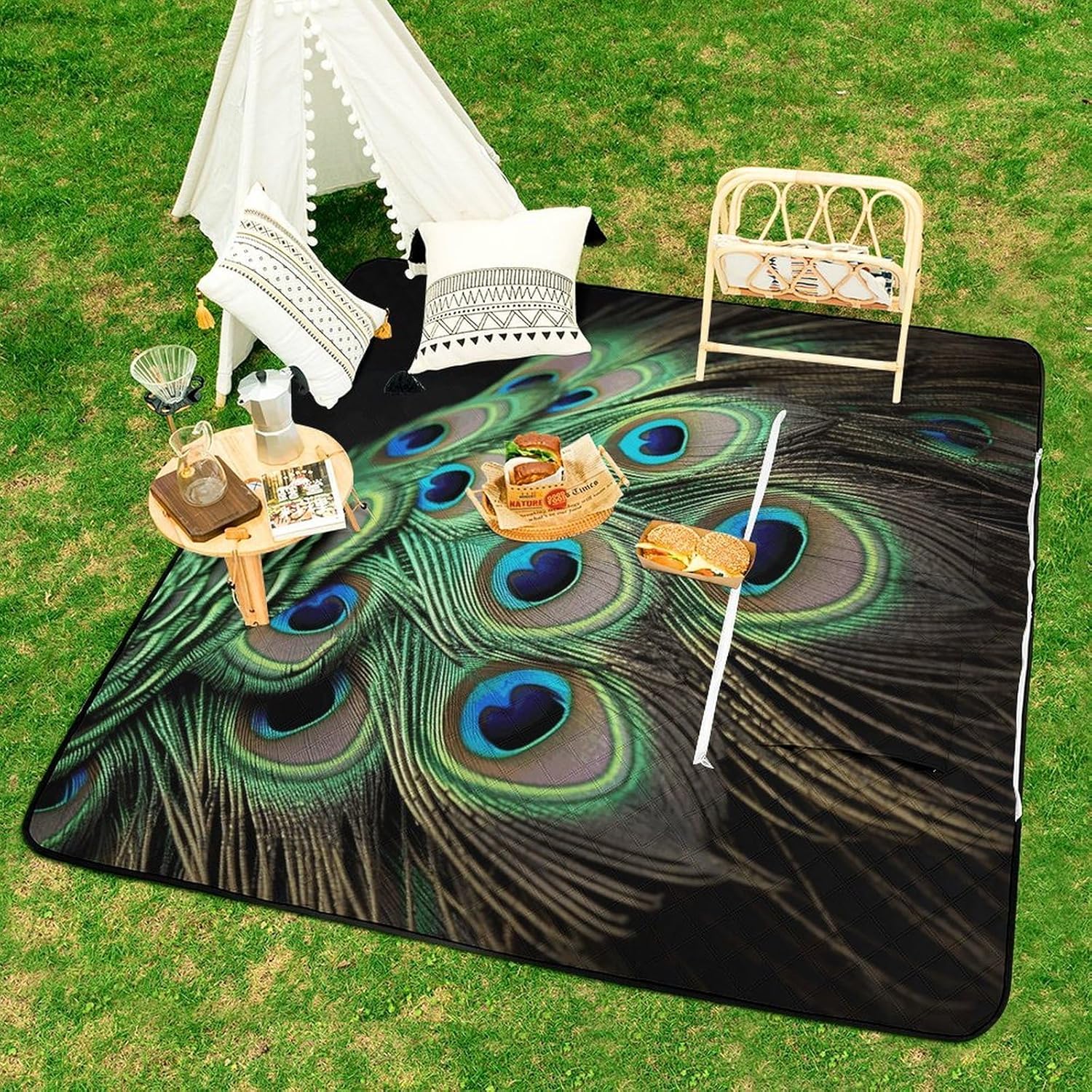 The picnic blanket ,we've only used the highest quality materials, so every picnic is an experience .The underside lining is very sturdy and therefore suitable for every surface. No more worrying about dirty or wet bottoms when you are sitting on damp grass. The Green Peacock Feather blanket protects you from water, dust and dirt.A large capacity bag and a picnic blanket, 2in1. It has a large capacity and one bag can hold everything you need for going out. You choose the place you want to lie down, and this bag can be turned into a comfortable picnic blanket in seconds also it can fold into tote bag, which is waterproof, sand-proof and wear-resistant.Therefor,you can take it to nearby parks, campuses, beaches or lawn, anywhere you want to lie down.