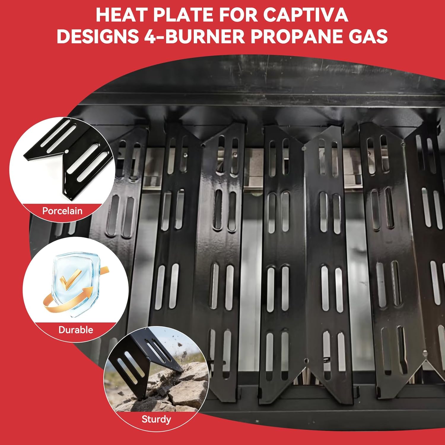 Grill Replacement Parts for Captiva Designs 4-Burner Propane Gas BBQ Grill, GR001 Heat Plates and Grill Burner for Captiva Designs, 4 Pack 【Fits Captiva Designs 4-Burner Propane Gas Grill Models】 Heat Plates and Grill Burner for Captiva Designs 4-Burner Propane Gas BBQ Grill, Grill Replacement for Captiva Designs GR001 Grill Replacement Parts 【Premium Porcelain Steel Heat Tent】 Heat plate replacement parts are made of high quality enameled for durability, and our replacement kits are stronger and last longer than the original parts for Captiva Designs GR001 gas grills 【High Quality Stainless Steel Burner】 Burner are made of high quality, due to the hard steel of the burner tube 【Package Includes】 4-Pack Stainless Steel Burner, 4-Pack Porcelain Steel Heat Tent 【After-sales Service】 If you have any questions about the product, please contact us promptly, our professional after-sales team is always at your service