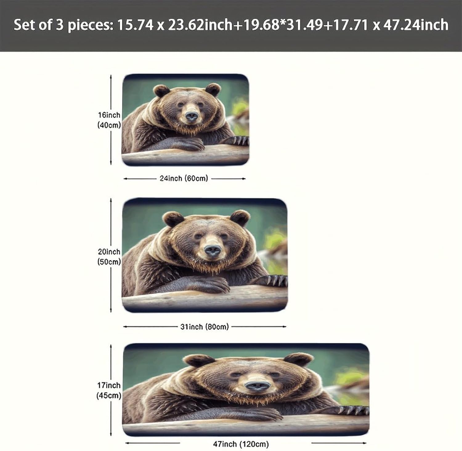 Transform your living spaces with this essential Grizzly Bear three-piece set of mats,designed to merge everyday function with effortless style.These washable kitchen mats,crafted from a distinctive Fiber Flannel,introduce a layer of plush softness that welcomes you from the first step.Imagine the comfort of natural,thickened fibers underfoot as you move through your daily routines,whether you're preparing a meal or freshening up.The set's versatile design allows it to adapt beautifully,serving equally well as farmhouse bathroom rugs or soft entryway runner rugs,proving that comfort should have no single address.Beyond their immediate comfort,these mats are conceived for real-life ease and adaptability.As dedicated anti fatigue Grizzly Bear kitchen mats for floor areas,they provide a forgiving surface during prolonged tasks.Need a reliable carpet for sink areas to catch drips and spills?This set has you covered.You can freely place them in moisture areas or traffic zones,knowing their performance remains consistent.These are more than mere kitchen utensils;they are subtle yet impactful seasonal home Grizzly Bear decor mats.Change the feel of your space by rotating them or moving them from a spring kitchen carpets setup to a cozy autumn nook.Their cohesive look ties different areas together,enhancing the overall beauty and warmth of your interior.Their breathable and gentle texture makes them a reliable companion in any room,offering a consistently pleasant foundation.
