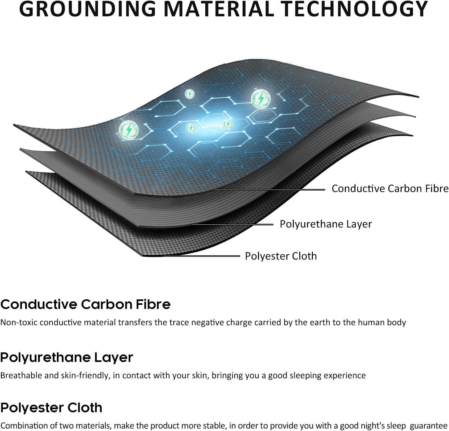 • Premium Material: Grounding mats is made of the Organic Conductive Carbon Fibre + Polyester Layer + PU Cloth, which is environmentally friendly and non-toxic. Earthing mat grounding pad is designed with breathable holes, lightweight and portable, soft and non-slip, with good conductivity and durability, ensuring that you experience the ultimate comfort and quality of sleep