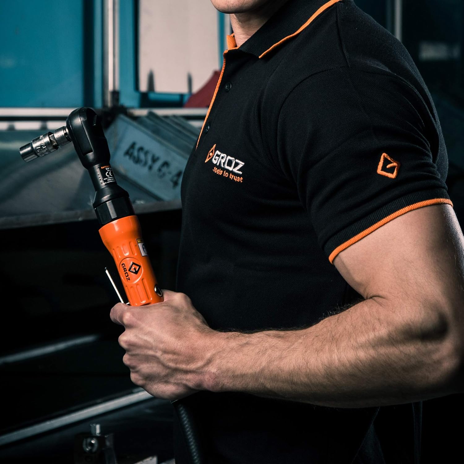 GROZ 61965 3/8” Air Ratchet Wrench. Robust & durable aluminum housing. Heat treated ratchet head design. Chrome molybdenum anvil guarantees high performance in the toughest applications. 50 Ft./Lbs torque