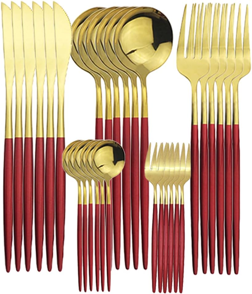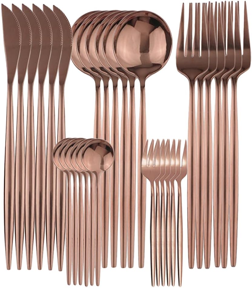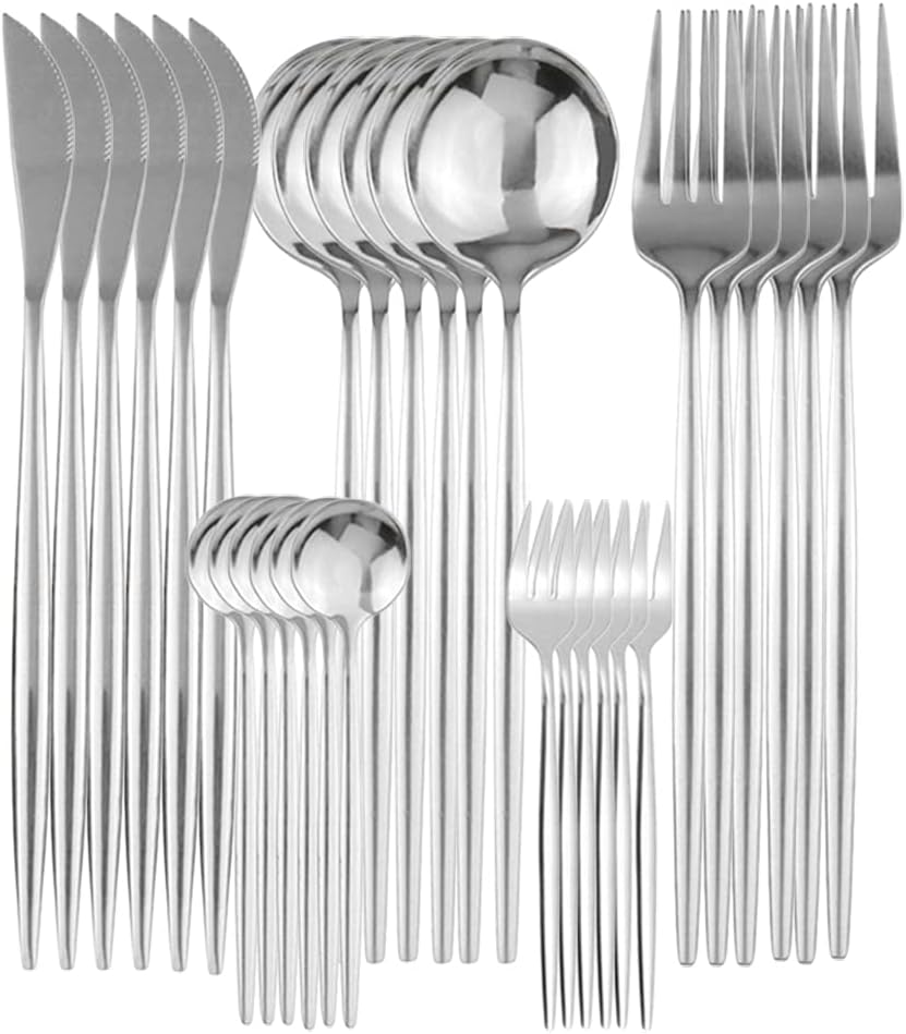 Products Include : Dinner Knife(220mm + 40g) Dinner Spoon( 21mm + 40g) Dinner Fork( 215mm + 30g) Cake Fork( 135mm + 10g) Tea Spoon( 125mm + 10g) The right size & proper weight With the right size and the proper weight that make people easy to control, it can be easily used by children and adults,and bring you a pleasant dining experience.