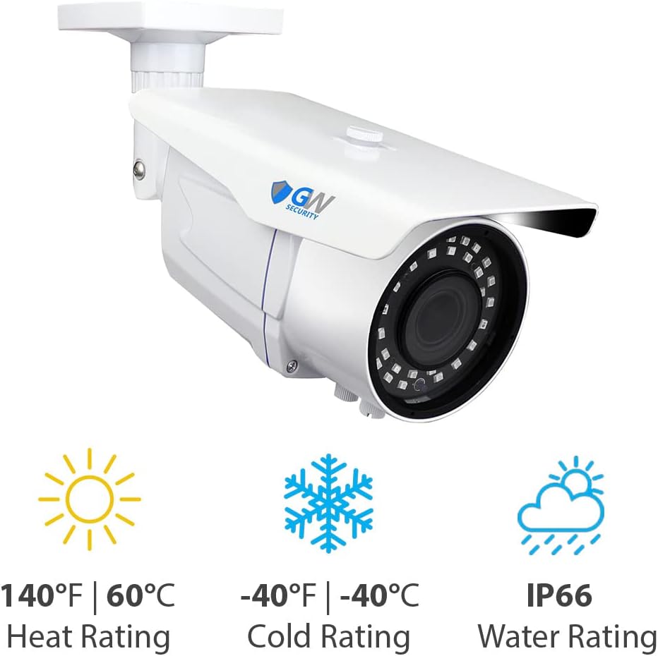 8 Megapixels (3840x2160) UltraHD 4K Video Record and Playback This GW Security 4K IP camera employs advanced high resolution 2160P in combination to the latest 8.0 Megapixel image sensor which provides the best quality full color day and night, resolution up to 3840 x 2160. This camera can record real-time 6MP@30FPS and 8MP@20FPS, so that recorded video plays back smoothly and clearly. With GW Realtime 4K 2160p camera, you can see your surveillance footage in stunning 4K resolution(FOUR TIMES the clarity of 1080p) for amazing detail and superior recognition of faces or license plates. Built in 2.8~12mm Manual Zoom Varifocal Megapixel HD lens with IR-CUT which allow you to adjust the angle of View. 36 pcs SMD IR LEDs illumination for recording video at night up to 196Ft. This POE camera is completely Power over Ethernet so setup is clean and simple with just a single cable. Designed for easy installation, the bullet camera has a waterproof housing, fits in most indoor and outdoor installations. It is ideal for HOUSE or business