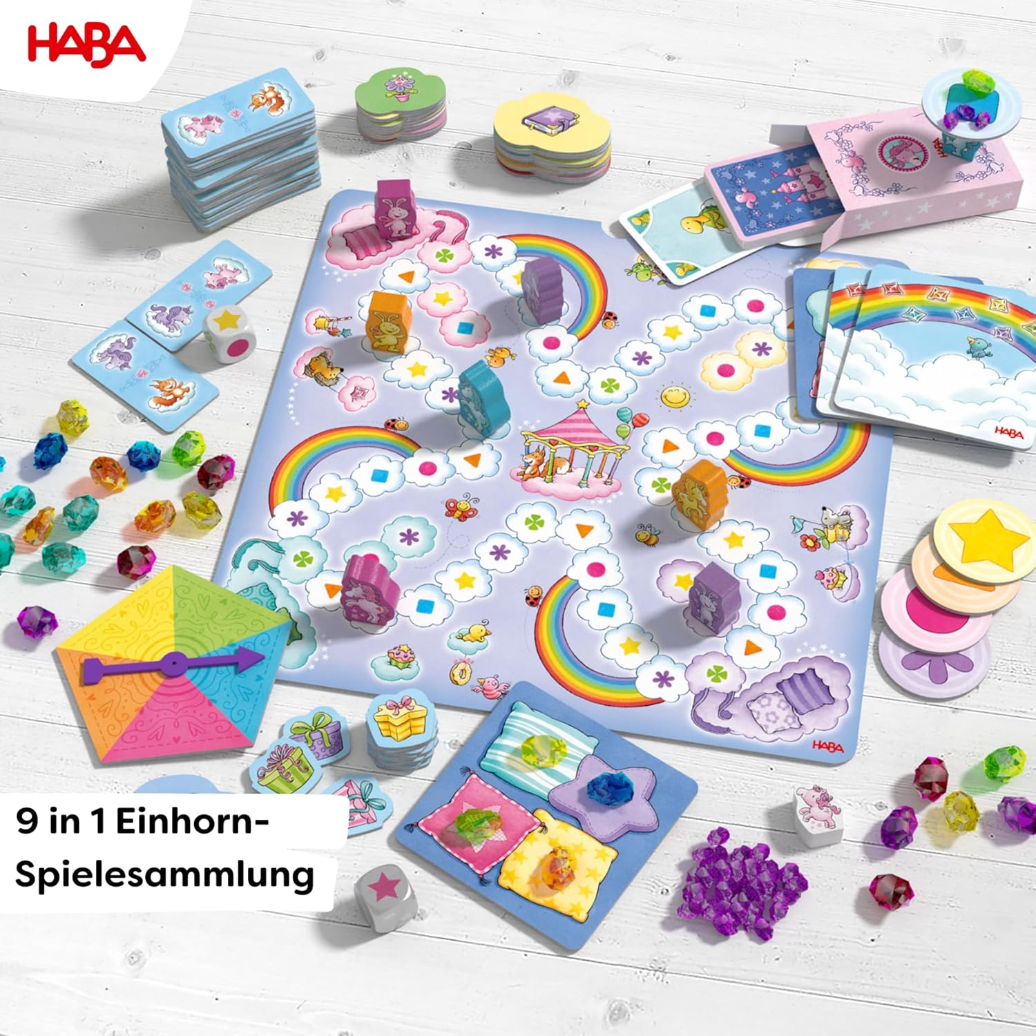 The large game collection contains 9 varied game ideas around the popular unicorn and her friends. Dice race, glitter dominoes, unicorn mouse mouw, crystals balancing and more. Boredom? Misindication! A magical fun for small and large unicorn fans. With simple rules, magical illustrations and high-quality play material.