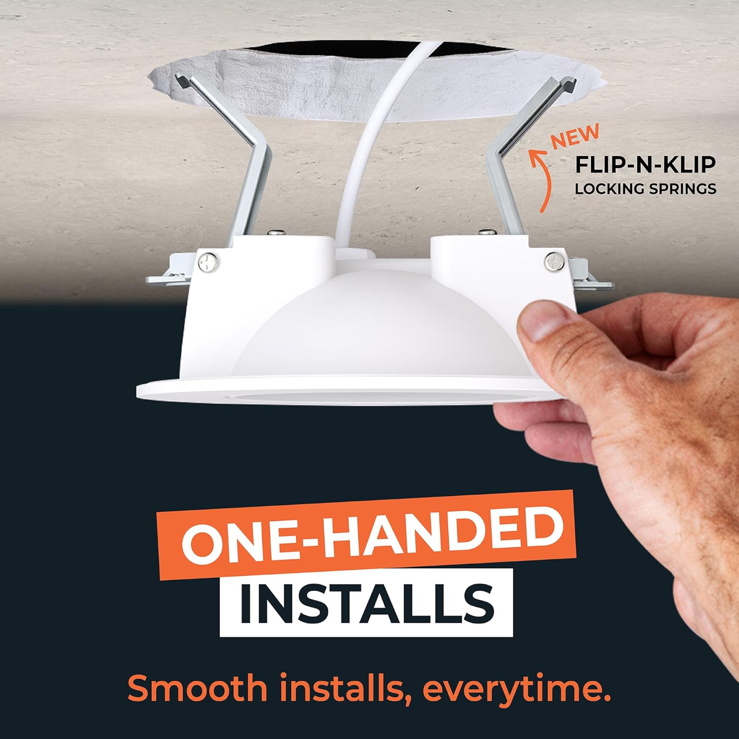 Transform your living spaces with the HALO HLA 4 in. Super Adjustable CCT Integrated LED Recessed Gimbal Downlight 4-pack, engineered to deliver exceptional lighting performance and installation convenience. These innovative canless recessed lights revolutionize ceiling lighting by eliminating the need for traditional housing or junction boxes, making them perfect for both new construction and retrofit applications. The standout feature of these LED recessed lights is their remarkable adjustability. Each gimbal rotates a full 360 degrees and tilts up to 90 degrees, providing unmatched precision for accent lighting, task lighting, or general illumination. Whether you're highlighting artwork in your living room, creating focused lighting in your kitchen, or adding ambiance to your bedroom ceiling, these 4 inch recessed lights adapt to your specific needs. Installation becomes effortless with HALO's revolutionary Flip-N-Klip locking springs technology. This innovative system eliminates the painful spring snaps associated with traditional recessed lighting fixtures, making setup safer and faster. The canless design mounts directly to drywall or suspended ceilings, significantly reducing installation time. Versatility defines these LED ceiling lights through their 5 selectable color temperature options ranging from 2700K soft white to 5000K daylight. This CCT selectable feature allows you to customize the lighting atmosphere for different rooms. The lights deliver 600 lumens per fixture with 90+ CRI for excellent color rendering, and they're fully dimmable down to 5% using phase cut LE/TE dimmers. Built for durability, these recessed light fixtures are AIR-TITE and Wet Location listed, making them suitable for both indoor and outdoor applications. Each light measures 4.72 in. x 1.54 in. x 4.72 in. and provides 50,000 hours of maintenance-free operation. HALO backs these premium LED lights with a comprehensive 5-year limited warranty.