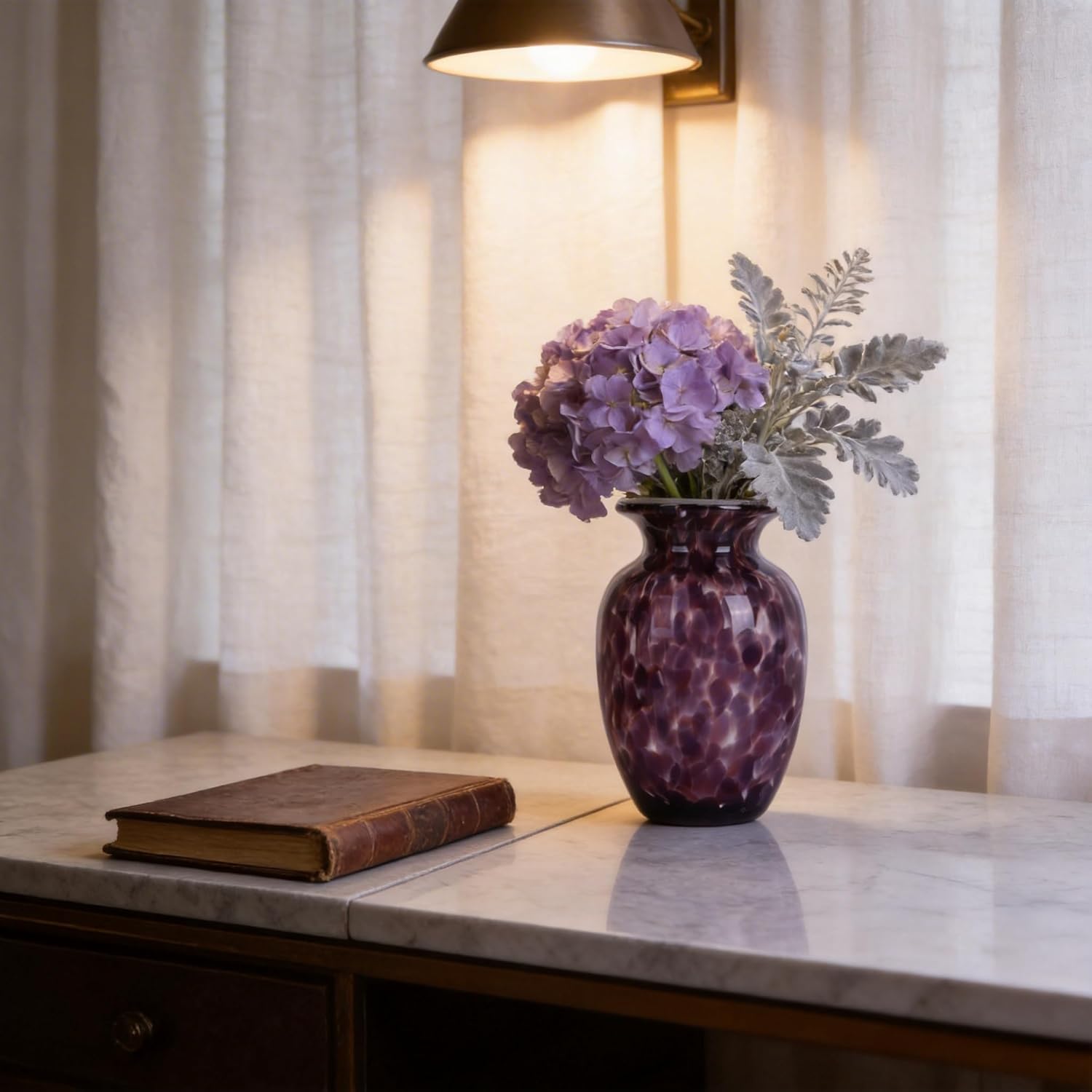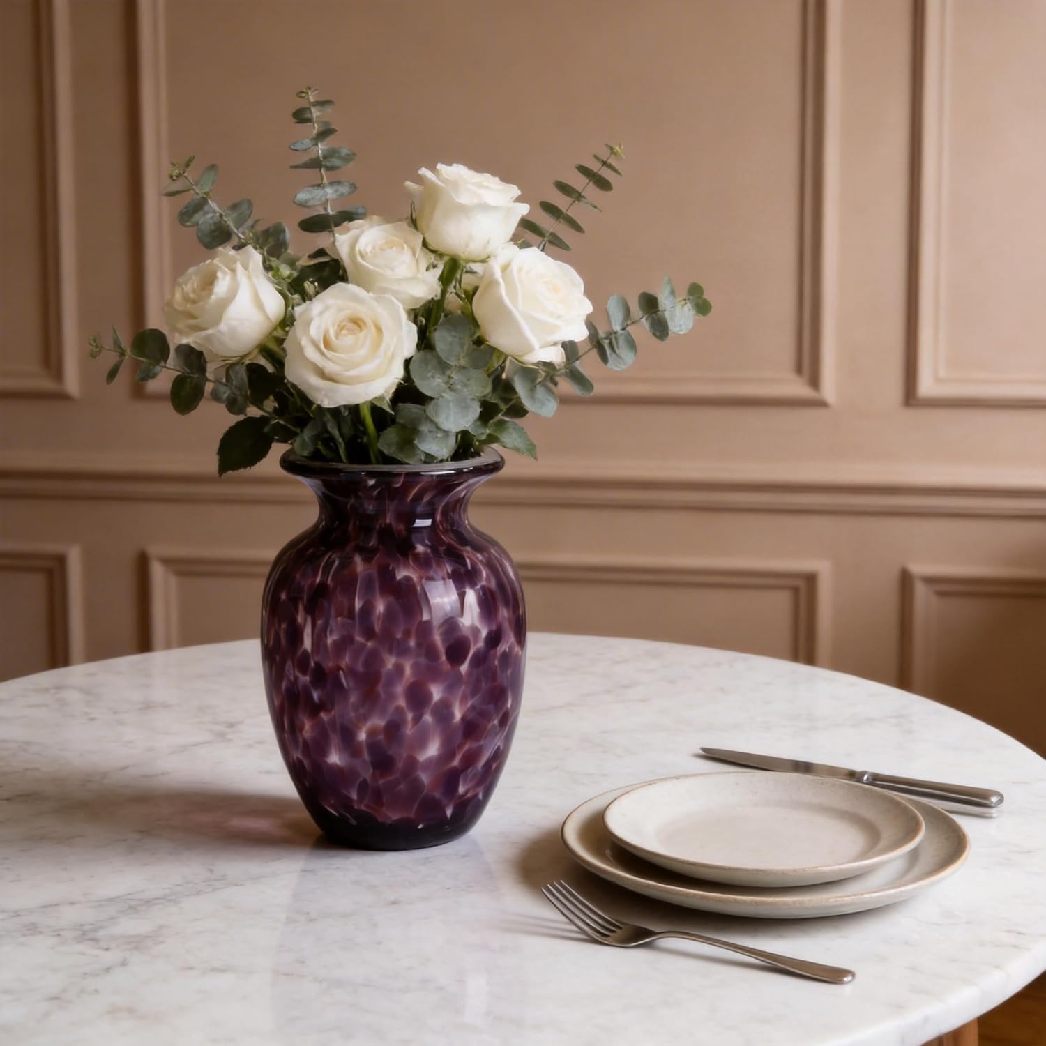 This glass vase is handcrafted by experienced artisans using the traditional blowing process for a colorful, lustrous and translucent finish. Each vase presents a unique speckled texture, like the sparkling sea water, adding a sense of art and hierarchy to your home space, a modern home boutique with both decorative and ornamental qualities. the design is simple and elegant, suitable for the living room coffee table, dining room table, entrance desk, bedroom nightstand, office desktop and other scenarios. Whether as a stand-alone visual focal point or paired with other home elements, it can inject a touch of bright artistic color into the space and create an elegant atmosphere. rounded body with open design, easy to put all kinds of flowers, such as roses, tulips, daisies, eucalyptus or dried plants. Whether it is for daily floral arrangements or holiday decorations, it can firmly support the beauty of nature and the delicate details of the art of flower arranging. This vase is not only a beautiful home decoration, but also a practical gift. Suitable for celebrating special moments such as housewarming, wedding anniversaries, Mother's Day, birthday parties, etc. It conveys tenderness and heartfelt feelings, adding a warm style to the living space of your friends and family. Made of high-quality thick glass material, the smooth surface is not easy to adhere to dust, easy to clean. Long-lasting color, not easy to fade or crack, suitable for long-term placement. Whether placed in natural light or light irradiation, can show a delicate and soft visual effect, enhance the overall sense of home quality.