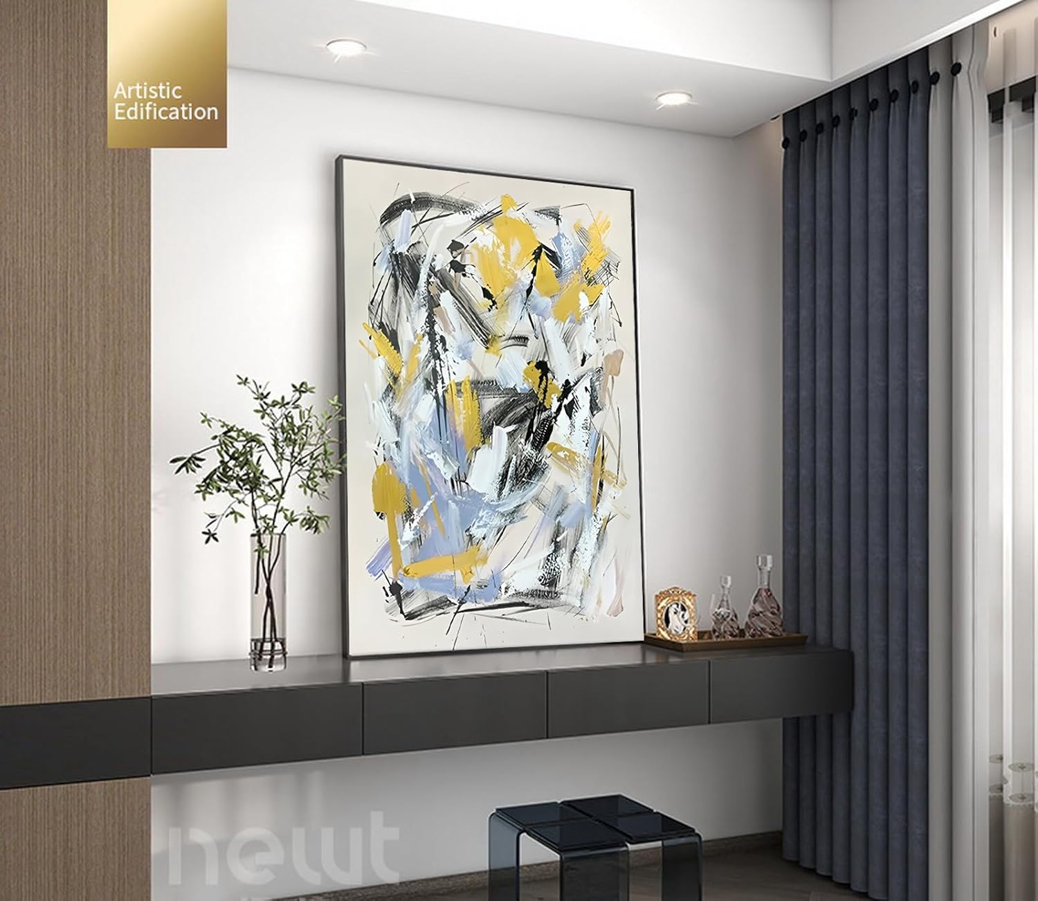 SPECIFICATION: Subject:Abstract Wall Art Size: 28x40inchx1Panels.Color:Yellow ,White,Grey,Black. PACKAGE: All canvas wall art are wrapped on frames, bracket mounted, protected by plastic bags and carton box. HOW TO INSTALL: Our canvas wall art comes already wraped with bracket mounted frame and ready to hang. Calibration :There might be a slight color difference of actual wall art from its website page due to monitors of different brands.
