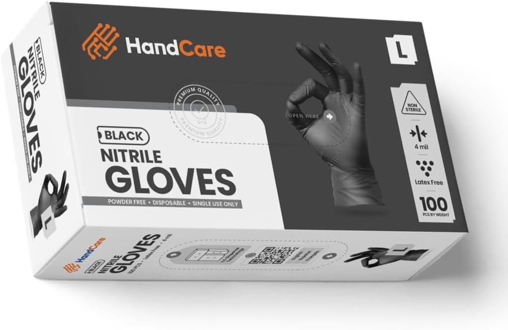 HandCare 4 Mil Black Nitrile Disposable Gloves are designed for users who need comfort, flexibility, and reliable protection for everyday tasks. The lightweight 4 mil nitrile construction offers an excellent balance of barrier protection and dexterity, making these gloves easy to wear for extended periods or frequent changes. Made with powder-free and latex-free materials, they are suitable for sensitive skin and reduce the risk of irritation. The textured grip helps maintain control on wet or dry surfaces, supporting precision and confidence during use. Choosing the Right Size & Pack Smaller sizes provide a snug, precision-focused fit for detailed work like tattooing or food prep, while larger sizes offer added comfort for longer wear. Smaller packs are ideal for home or light professional use, while bulk packs support high-volume environments such as clinics, kitchens, and commercial operations. Whether you’re working professionally or handling everyday tasks, HandCare 4 mil nitrile gloves deliver dependable performance with lightweight comfort.