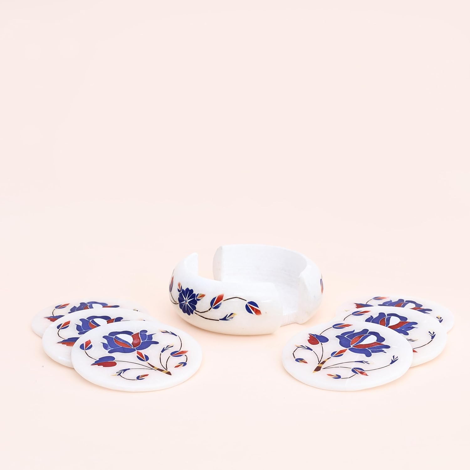 These handcrafted marble coasters bring timeless elegance to your home with their exquisite blue and red floral inlay design. Created using the traditional Pacchikari stone inlay technique, each coaster in this set of 6 showcases meticulous artistry passed down through generations. The white marble base is adorned with delicate floral motifs featuring vibrant blue petals and red accents, creating a stunning visual contrast that complements any décor style. Measuring 3.3 inches in diameter, these coasters are perfectly sized to protect your furniture from water rings and heat marks while adding a touch of sophistication to your coffee table, dining room, or office desk. The convenient holder keeps all six coasters neatly organized when not in use, making storage effortless. Each piece is individually crafted by skilled artisans, ensuring that no two sets are exactly alike. These marble coasters make an excellent gift for housewarmings, weddings, or anyone who appreciates fine craftsmanship and functional art. Their durable construction ensures they'll protect your surfaces beautifully for years to come.