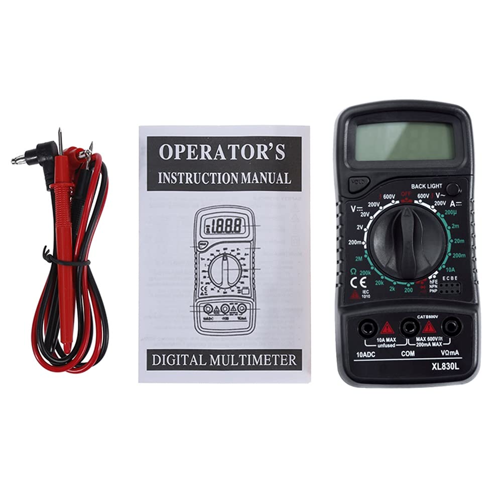 The Digital Multimeter is a practical tool for electrician use. It is easy to operate and the readings indicated directly on the screen.Max display: 1999, Auto polarity display.Portable and compact design, overload protection on all ranges.Diode assembly test/Transistor P-N junction test/Transistor HFE test.Continuity test with buzzer sound in circuit.Features: Voltage: 200mV/2V/20V/200V ±0.5%, 600V ±0.8%.AC Voltage: 200V/600V ±1.2%. Current: 200μA/2mA/20mA ±1%, 200mA ±1.5%, 10A ±3%.Resistance: 200ω/2Kω/20Kω/200Kω/2Mω ±0.8%.Fuse protection: F-200mA/250V.Operating Temperature: -0 to 40.Overrange Indication: Only figure "1" on the display.Polarity Indication: "-" displayed for negative polarity.Low Battery Indication: - /+ display.Battery: 9V (Battery not include).Dimension: Appro 13cm * 6cm * 3cm# Battery won't be included in shipping becased of new air post regulation.Note:Due to the difference between different monitors, the picture may not reflect the actual color of the item. Thank you! There might be 0-1cm errors due to manual measurement.Please allow slight error of measurement.Package included 1 x LCD Digital Multimeter2 x Test Loads.1 x English User Manual.Low Impedance Mode Multi-Tester,Resistance, Continuity, with Leads and Cord Manual-Ranging 600V Tester, Tests Batteries, Current